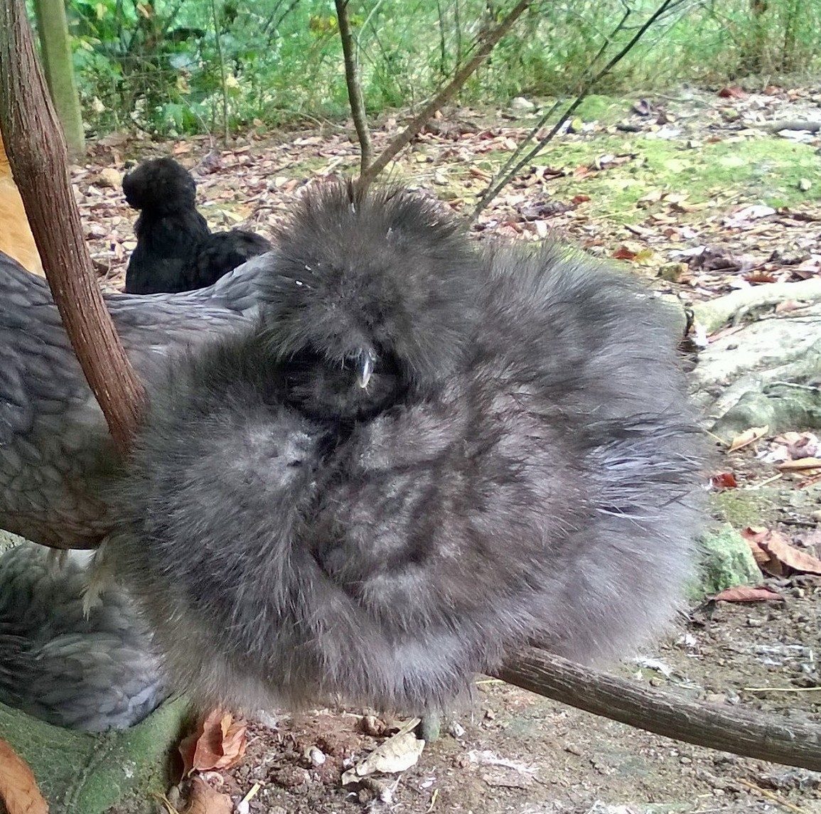 You'll note she is small crested. She is not a showbird. She works in our flock of free ranging birds. Basically because she can see. She's spunky enough to tolerate larger flock members and she has proved her worth in our flock as a broody hen and excellent mother. She has quite a bit of character & tenacity as you can imagine. She winters well in the upper midwest. A silkie with a larger crest would not really work well in our set up.
