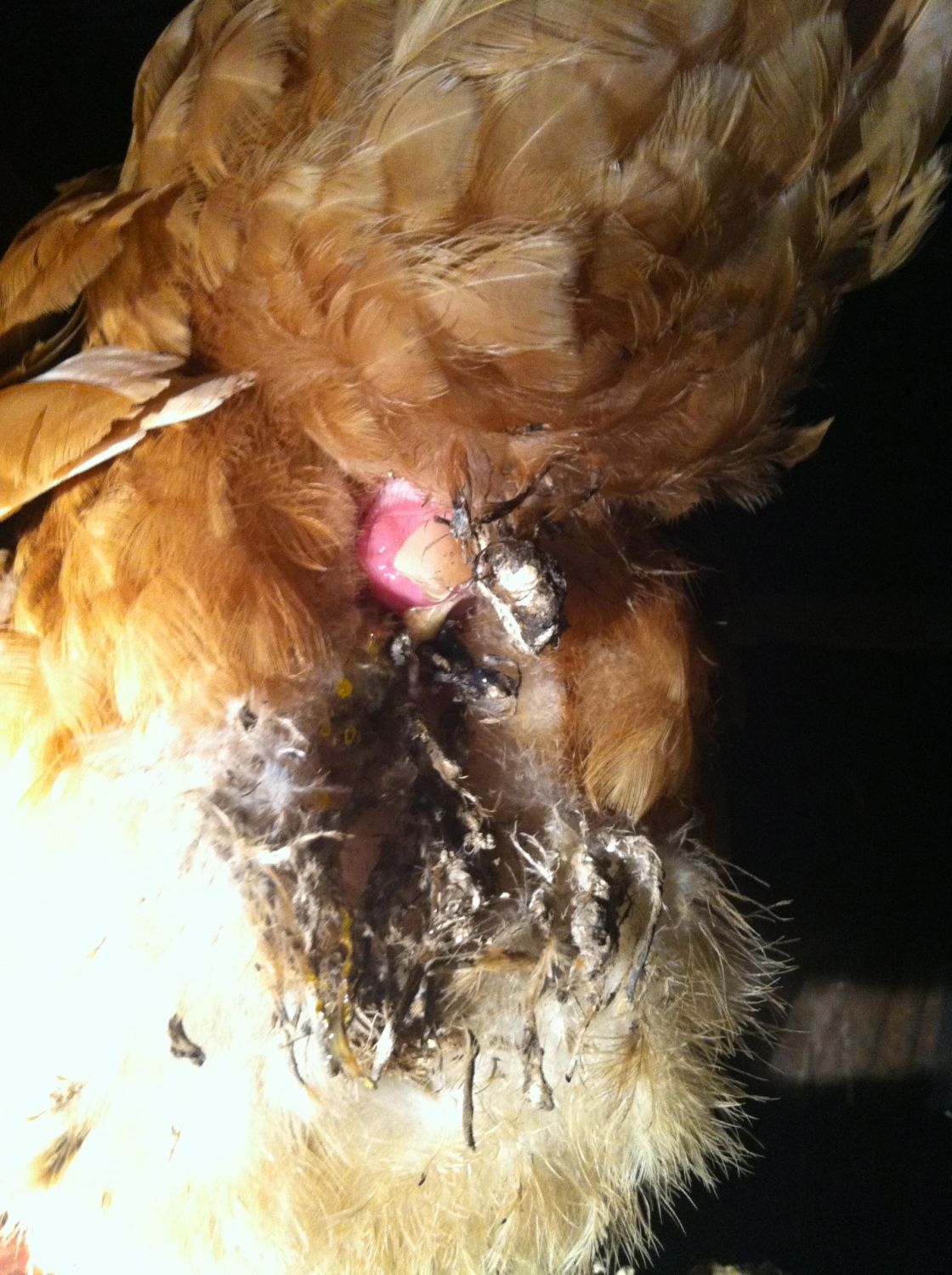 Closing up the coops tonight, I noticed a totally shellless egg on the ground (no membrane at all, just yolk and albumen). I looked up on the roost above to see who it came from and this was what I saw. I'm less concerned about the mucky black stuff--it is the pink area with the white hemorrhoid-looking thing coming out of it that has me troubled.