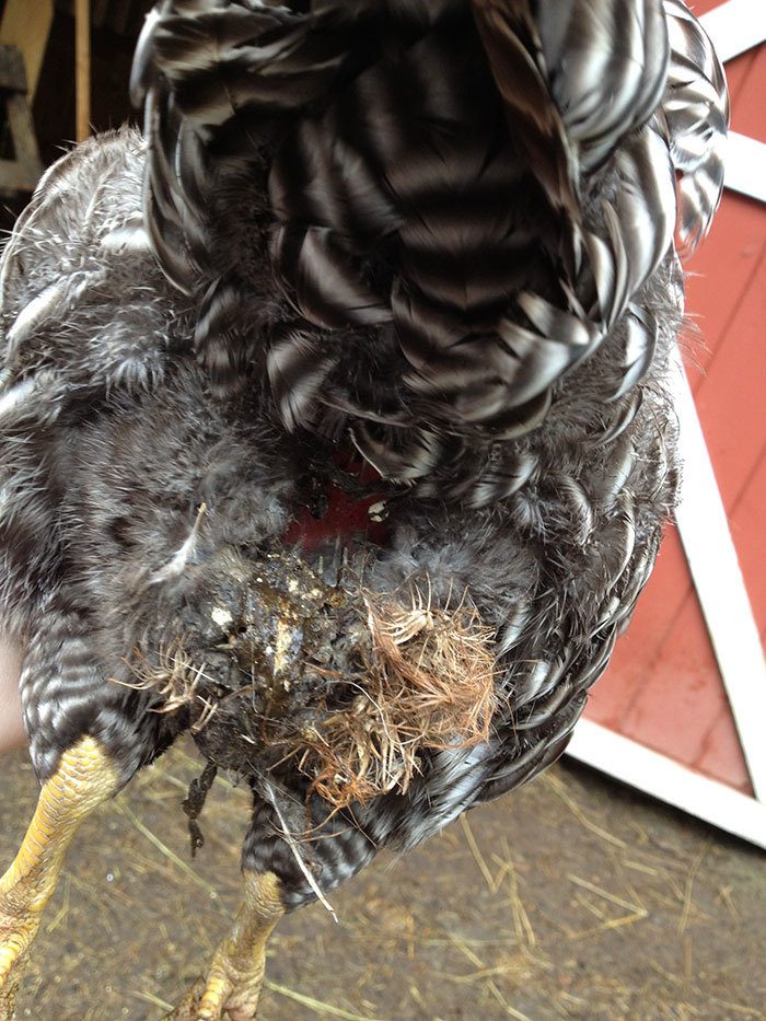 As I was going to see the chickens today I noticed something funny hanging between the legs of my hen. After I caught her I noticed that it was a ball of feathers and chicken poop. It fell off - belch. After a more careful inspection it looks like all the feathers have come of her rear end and she's plain bald there. From the gloppy mess that fell it looks like she may have diarrhea. I have another chicken with the same. I'm trying to think why this is happening and can only come to this one conclusion.....please tell me if I'm right. A couple of weeks ago my husband combined our chick pellets (we have some new pullets) with our layer pellet. We are getting to the bottom of the barrel where it may be a higher concentration of the chick feed (not mash but pellets so they look the same). Could this be the cause of the issue? We have also been getting really soft eggs. Not transparent but fragile and tough to crack because they just all fall apart when you do. If you think this is the cause - easy enough to make sure they get the right food. BUT....what do I do about their behinds? Do I just let it heal by itself? Do I have to cut away the down and feathers that are surrounding the sore spot? My poor girls.