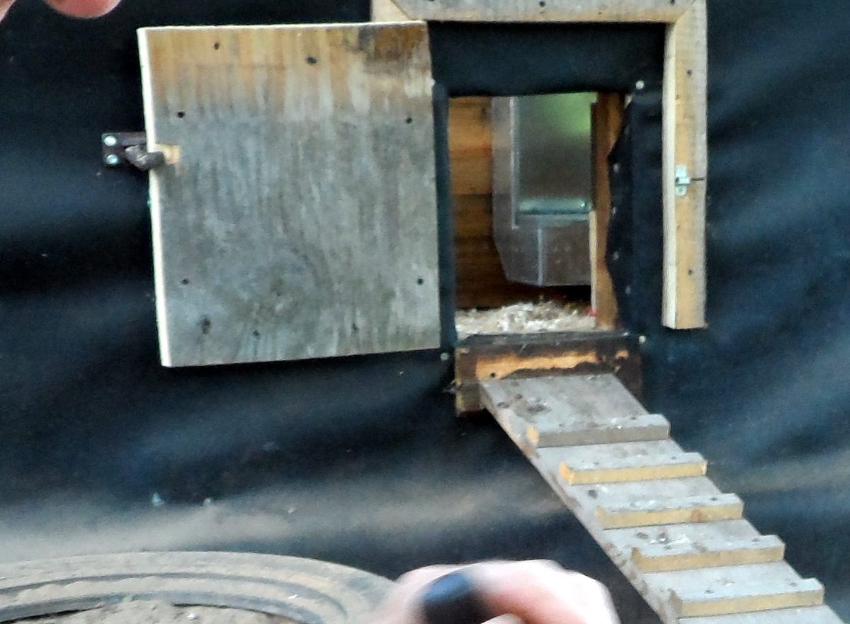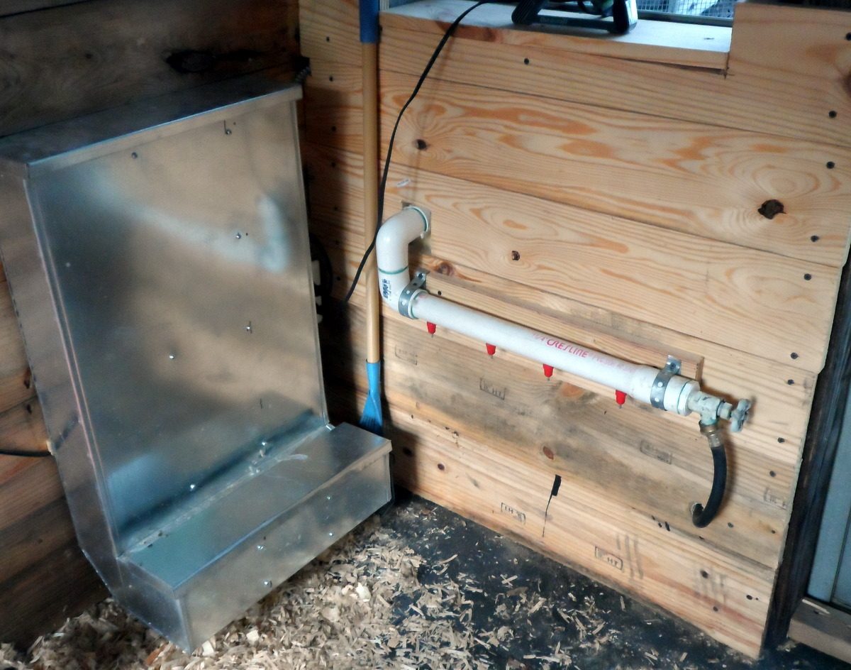 Feeder (my hubby made this..he is a sheet metal mechanic)..there are 3 slots...2 for feed and one for corn...you fill it from the top and the bottom cover comes off. The watering system has a valve with a hose going outside so we can flush stale water out.