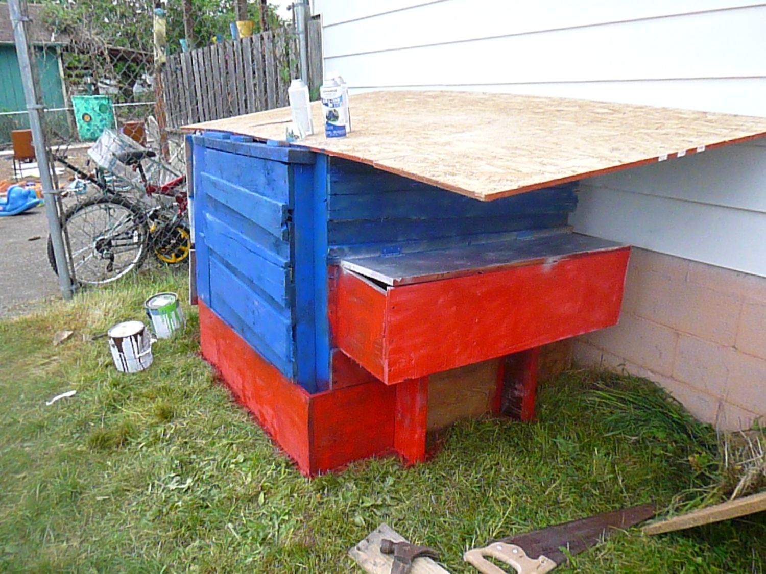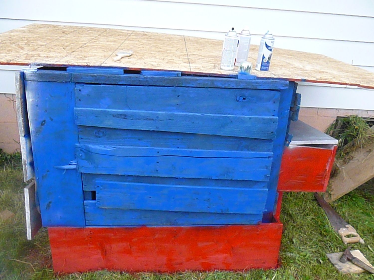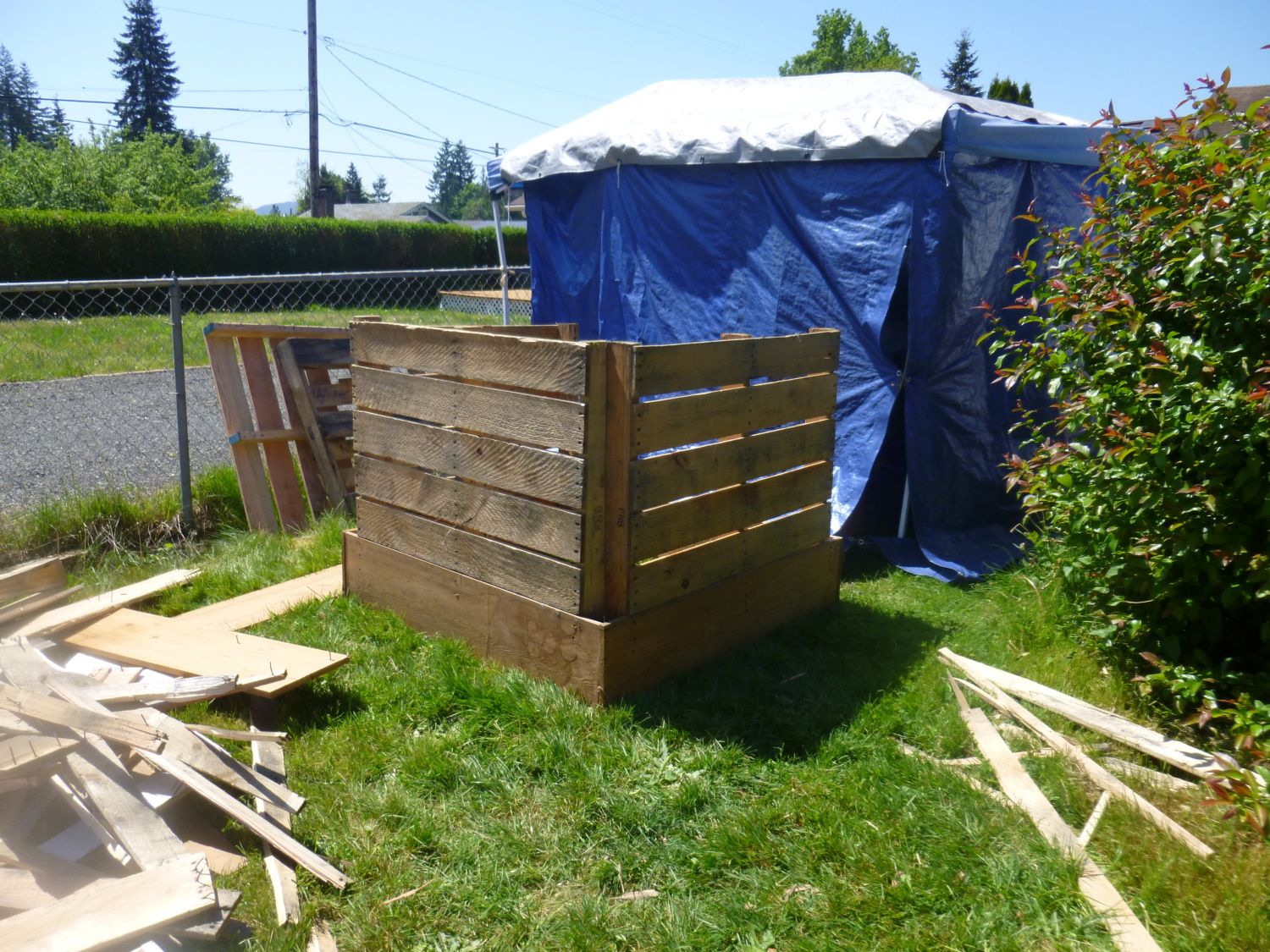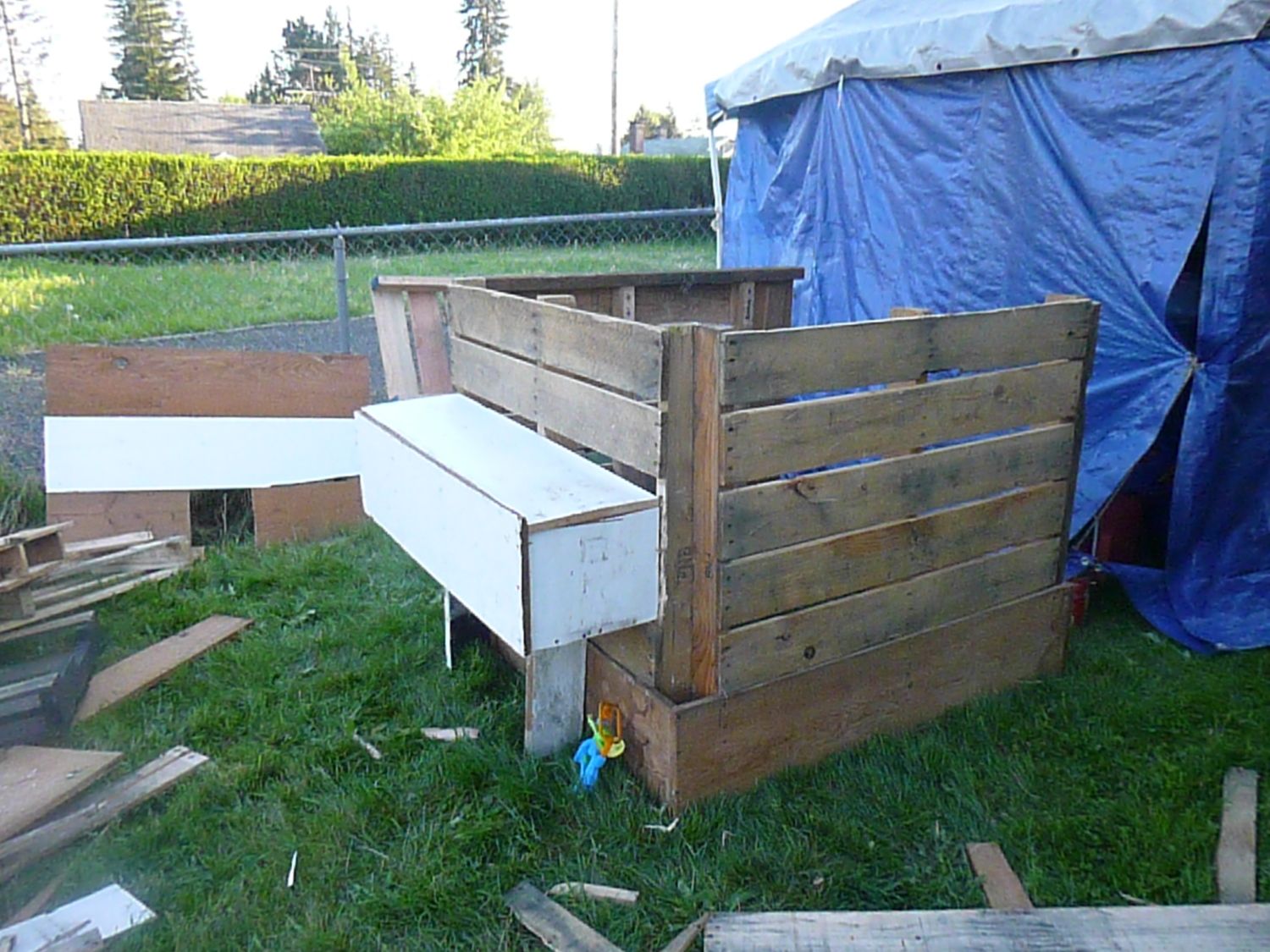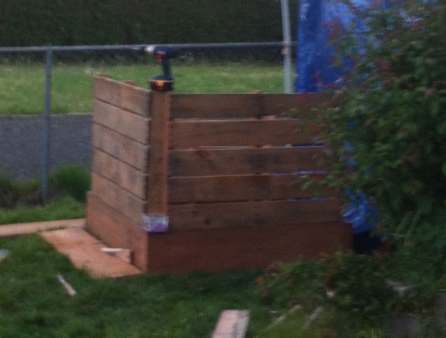 Some boards were unused old garage shelving that my mother never used and gave to us. (Made 5 raised garden beds today too with those!!!) Screws we already had, and got a whole bunch of pallets from a store in town that was fine with us taking them.