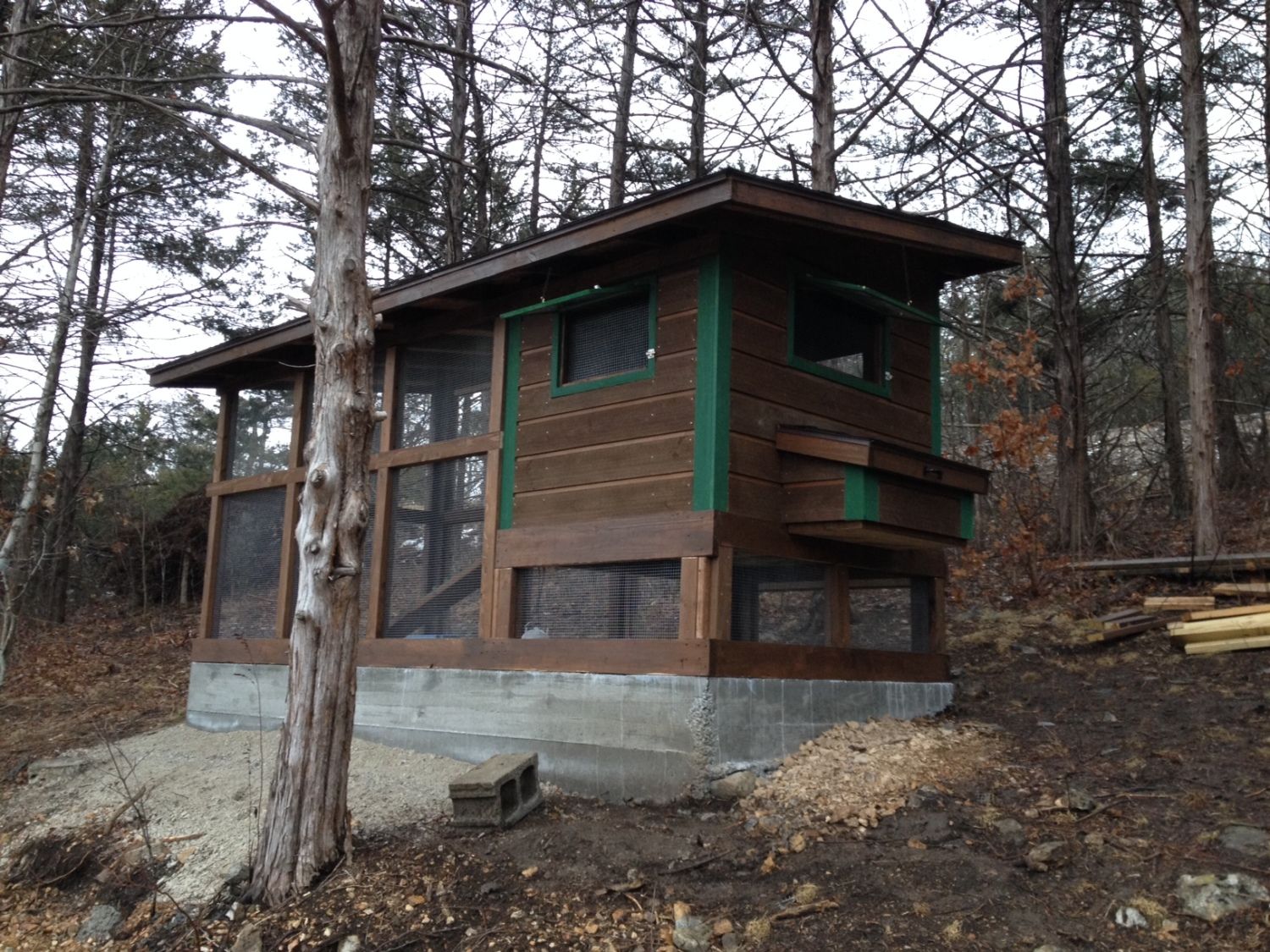 The foundation was a necessity because of the grade of the hill side. It just happened to work out that we were having our drive way poured in concrete so I was able to form it up and have them order a little extra on one of the trucks and just pour it that way. Between the hardware cloth and the concrete I shouldn't have to worry about any critters getting the girls.