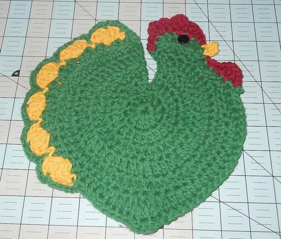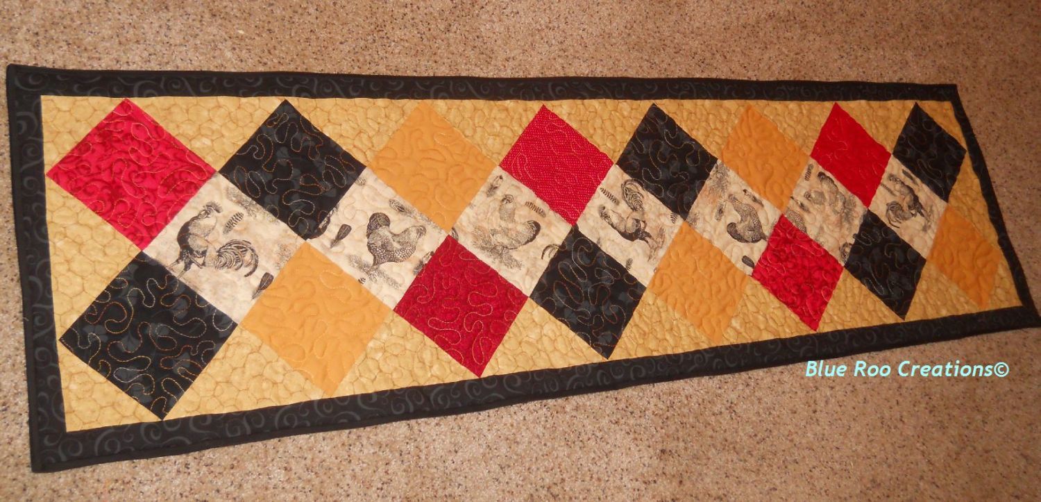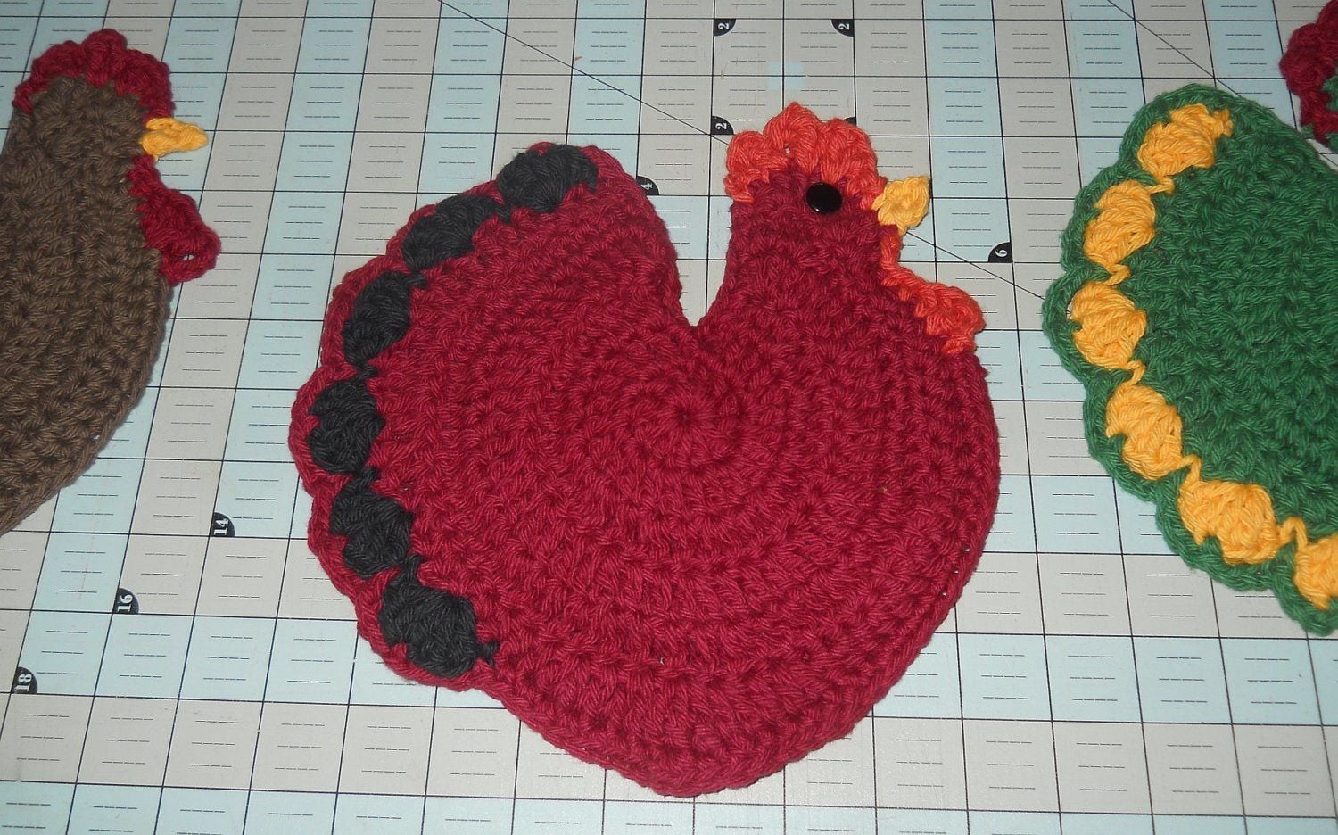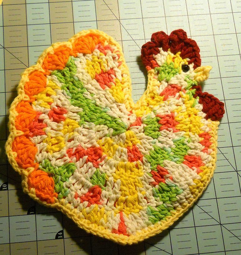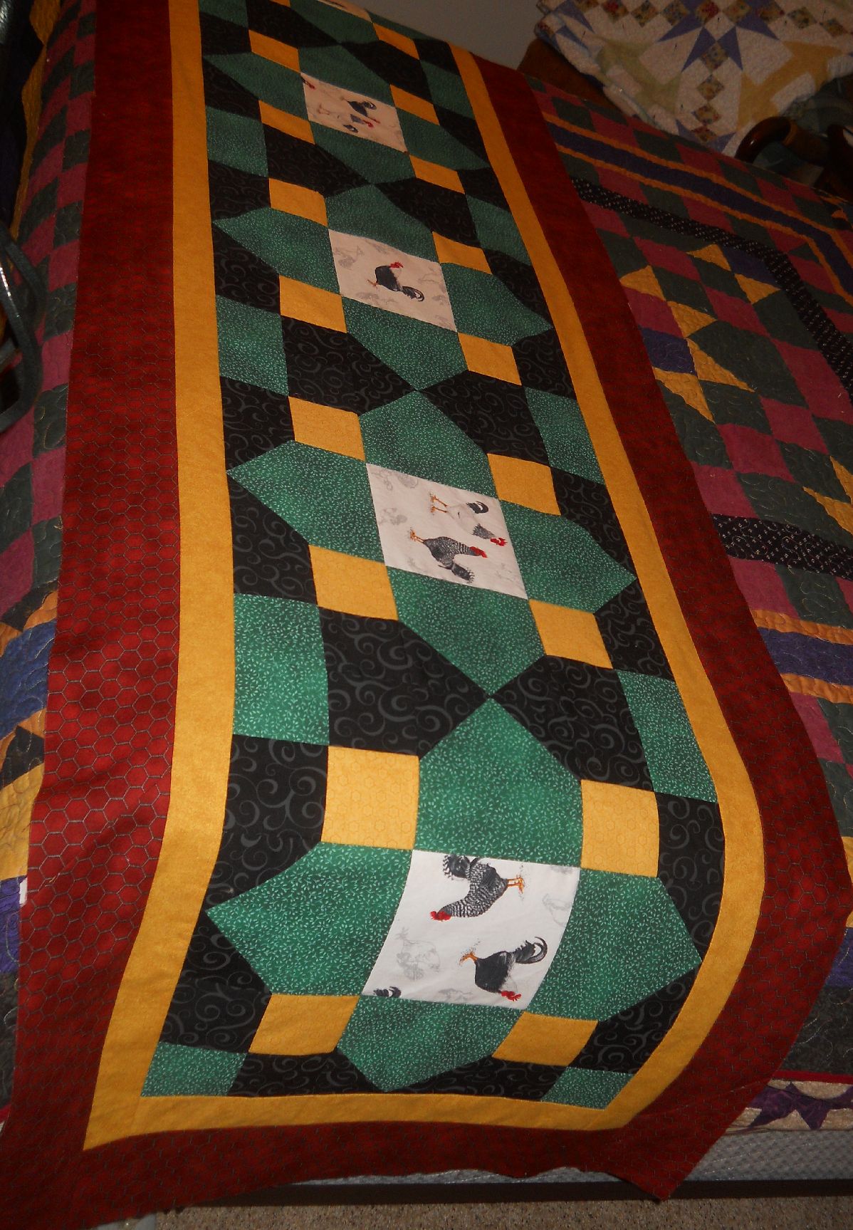 Love the chicken print quilt, terrific fabric! And the hot pads I happen to know for a fact are great (although mine is on the wall, not under a hot dish, lol).