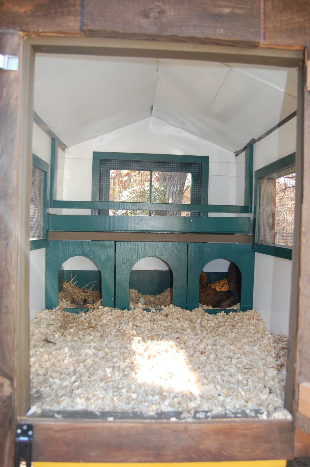 The hens use the rolling coop mainly for laying eggs.