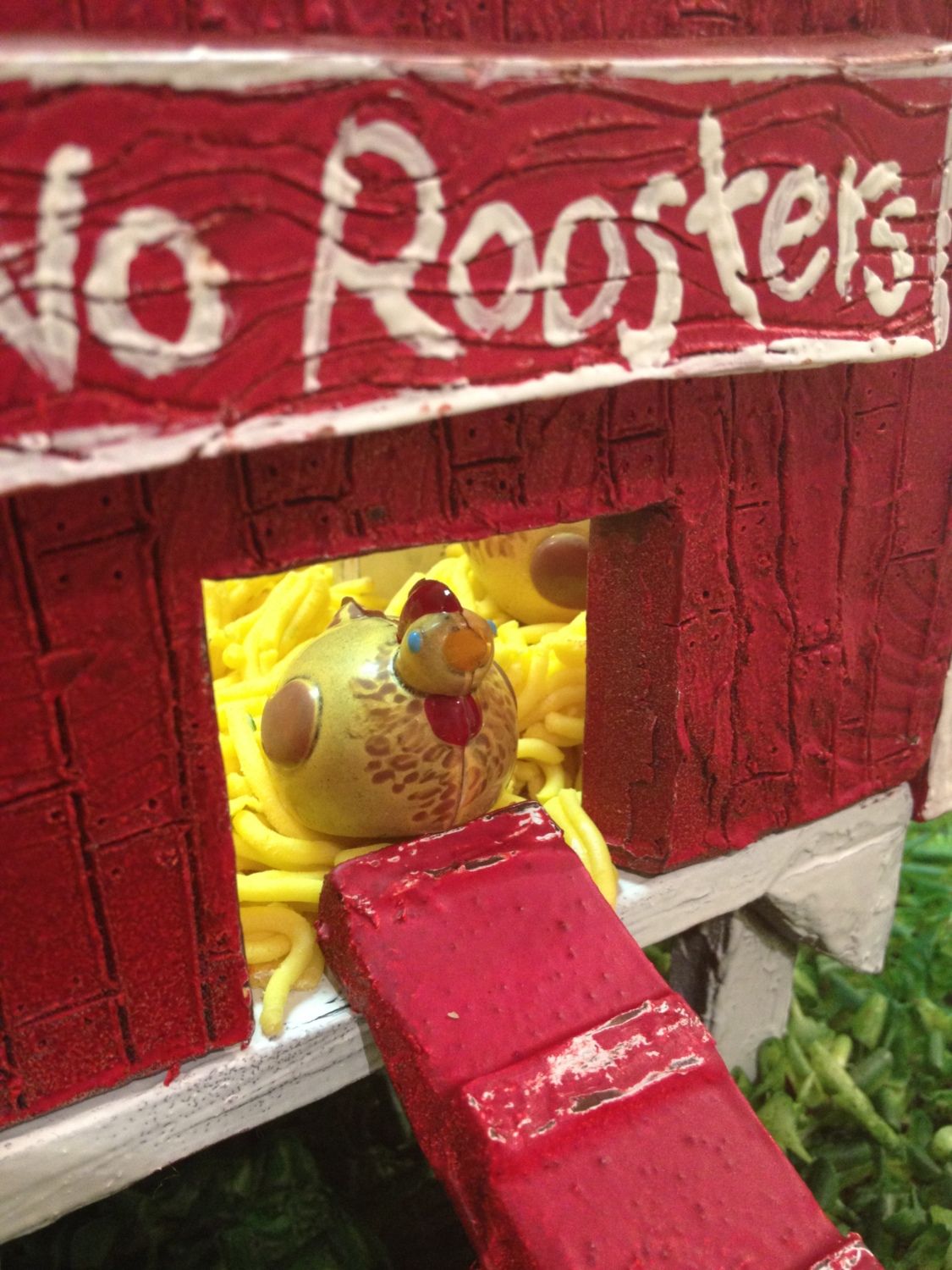 Those little chickens area Adorable!!Handmade. hand-painted Chocolate Hens and Henhouse. The whole thing is edible. We used over 5lbs of chocolate to make this. We entered into a chocolate contest and won Best Visual and Best Chocolatier. My flock inspired me to create this sculpture. It was painted and decorated by Olivia Perry and conceived and produced by myself. What fun!