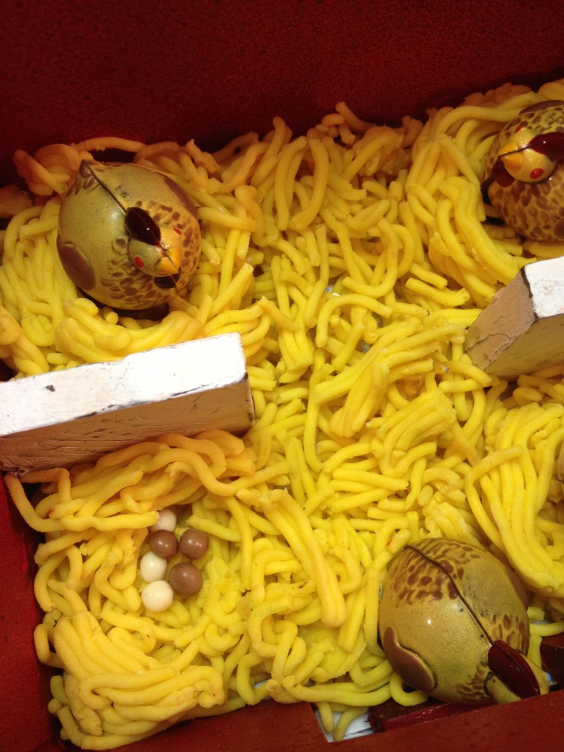 Little dark and white eggs made from chocolate-covered crispies. Straw is made from white modeling chocolate colored with gold cocoa butter. I learned a handy new use for my garlic press!