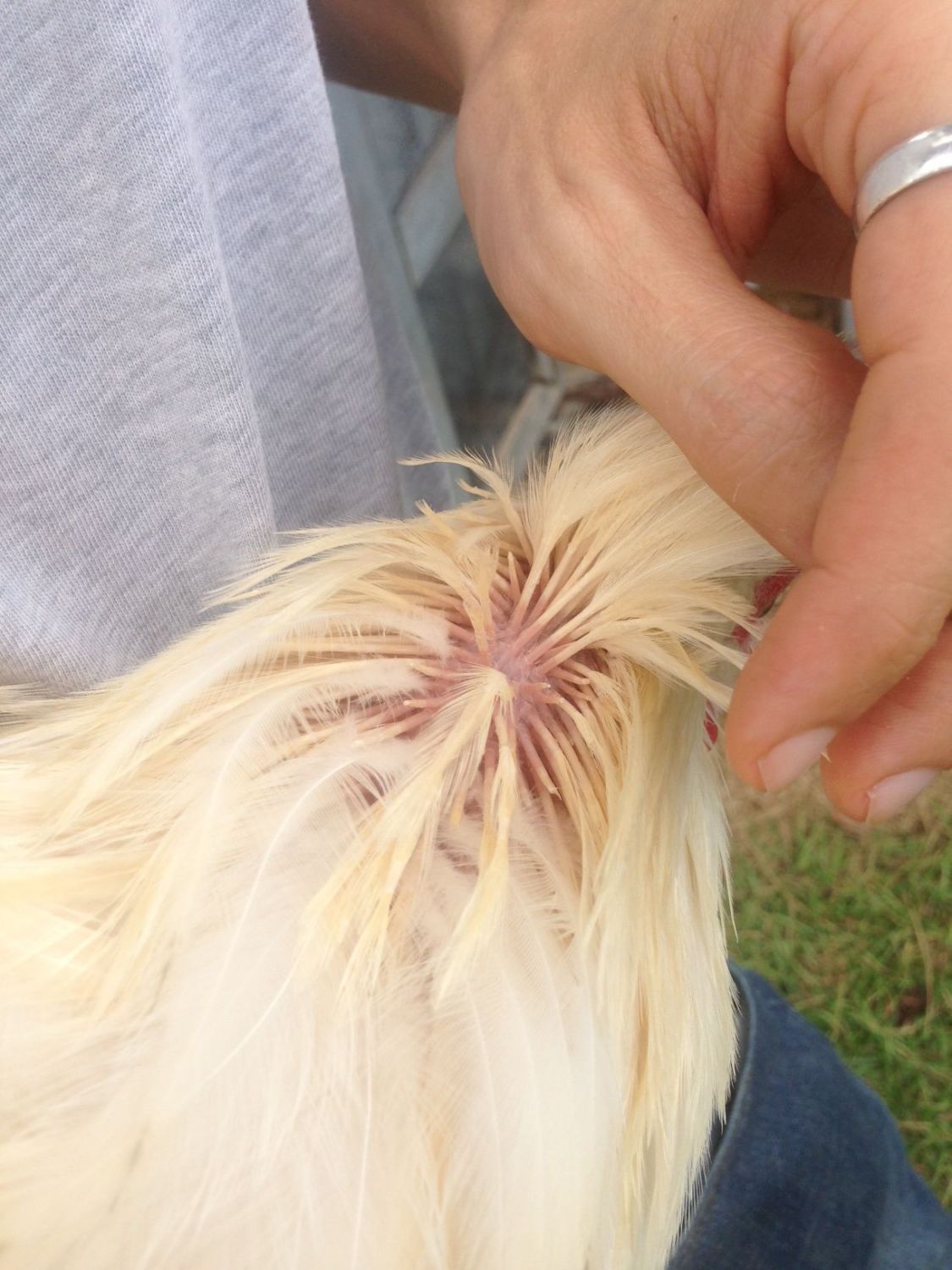She appears to be growing in new feathers. In the early months of their life, chickens are almost constantly replacing feathers on some part of their body. Then, at about a year of age, they go through a complete molt, when they lose basically all of their feathers and grow them back in.