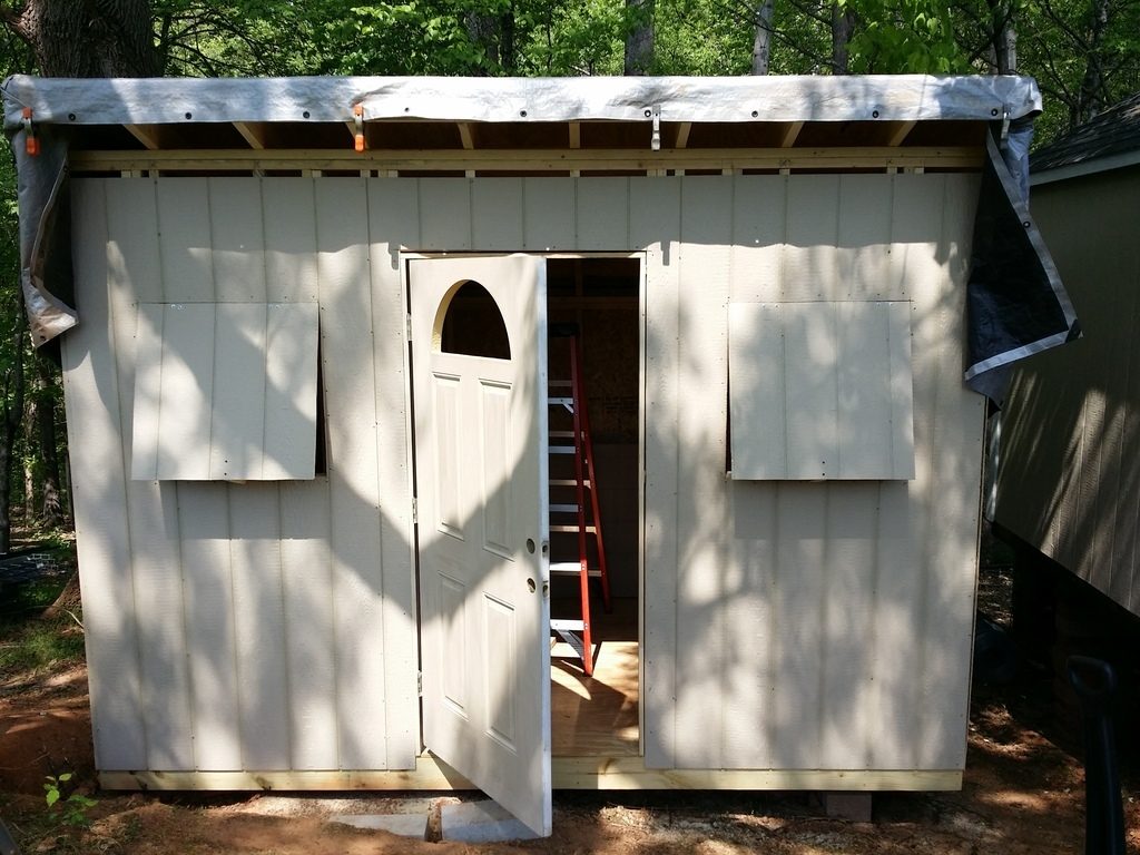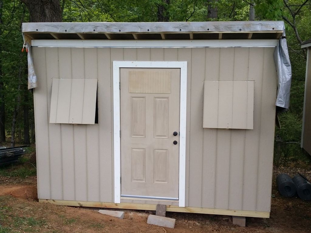 Waiting for the floor to cure. The flip outs will be windows (I have to make them) and the door will have a window. There are windows on both sides also. The front and back soffits have hardware cloth already. I used 2 x 6's for the roof rafters instead of 2 x 4's just to raise it a little higher for more ventilation.
