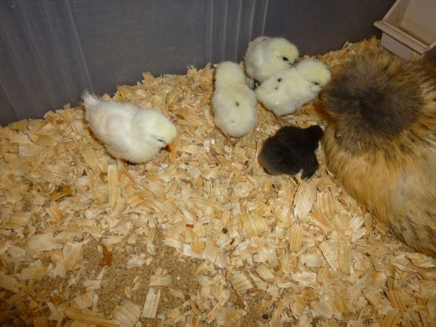 And below is my recent hatching of mutts...none are from the broody in the picture.