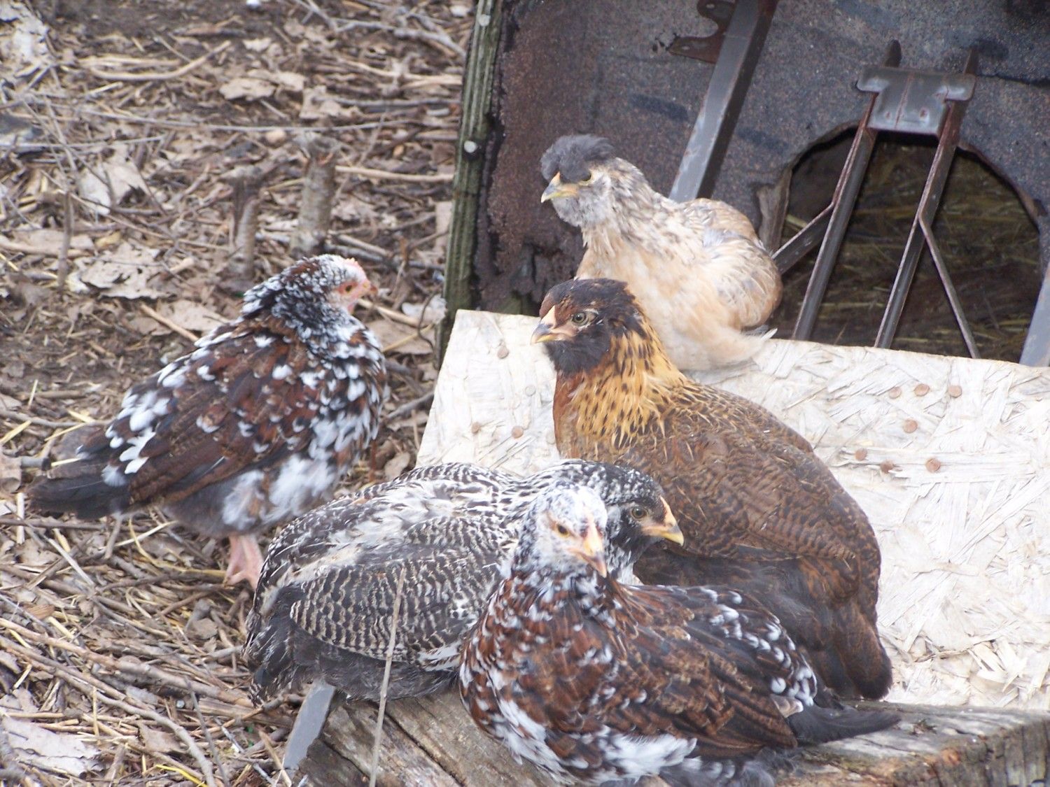 Here are some of my older chicks. Keeping together since it's chilly out today. Two are SS, Two EEs, and a Polish mix.