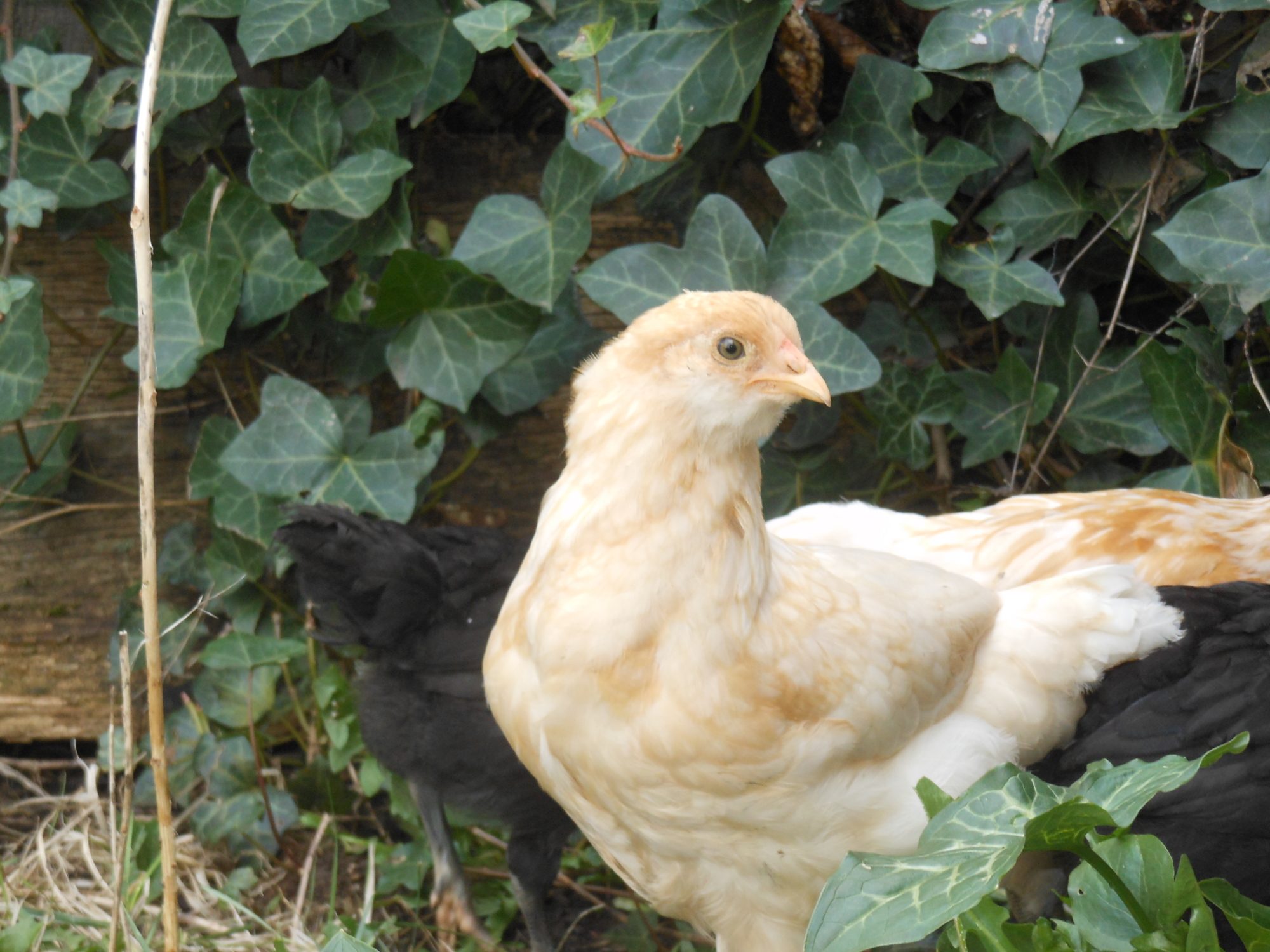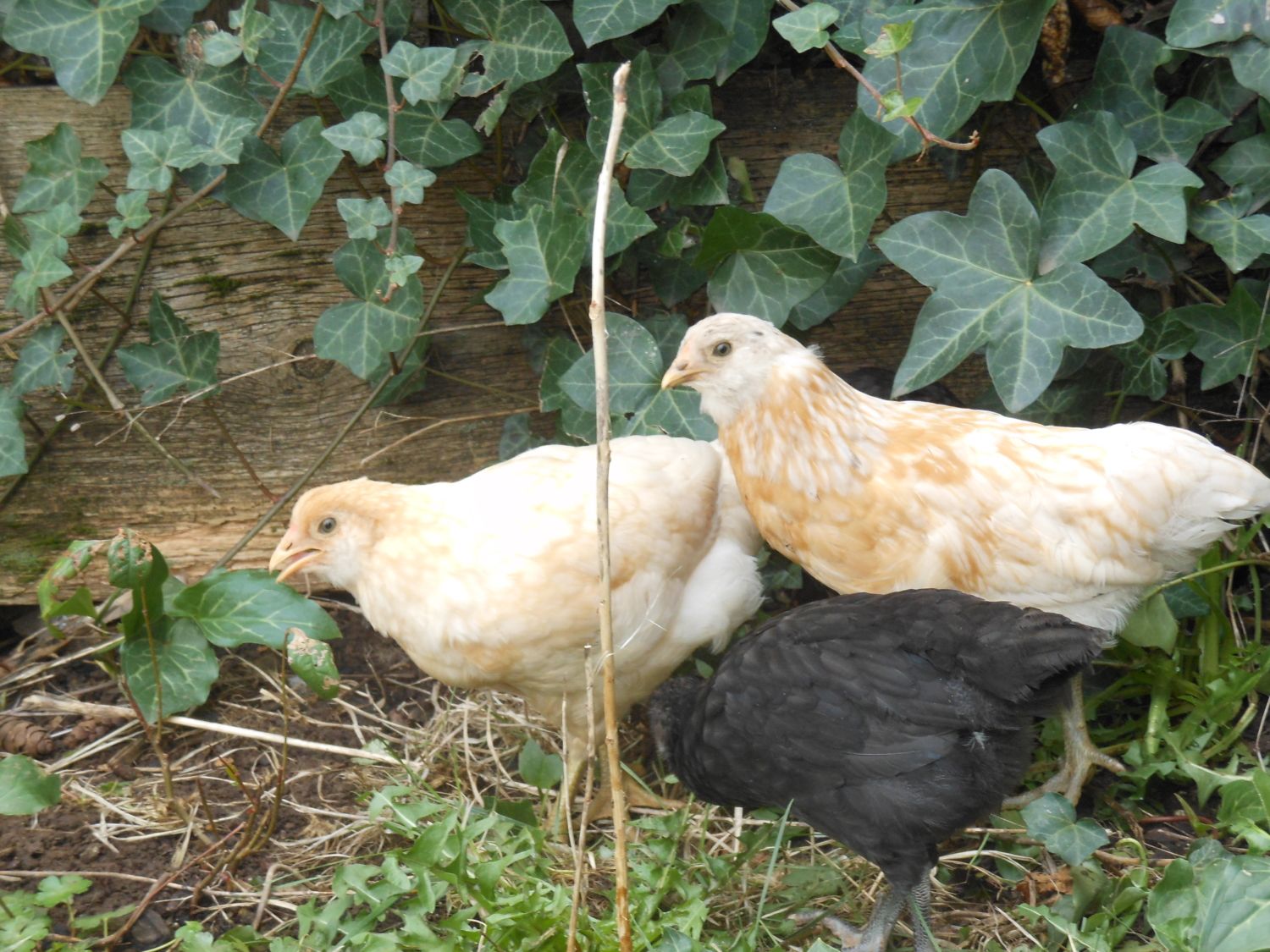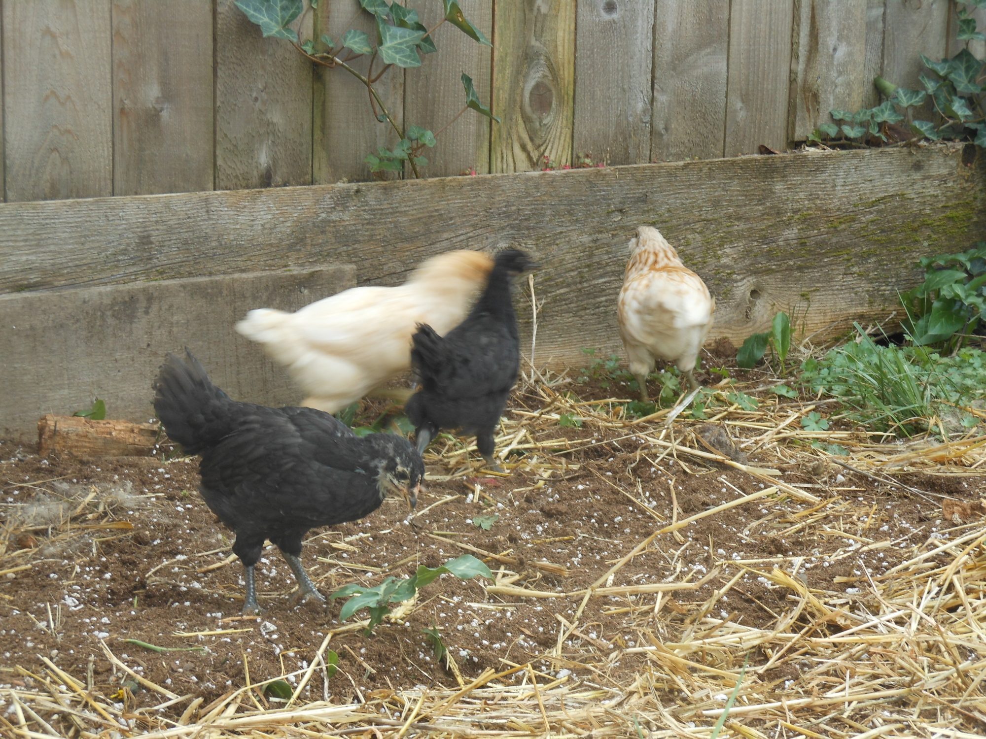 Two Black Australorps and two Yellow Ameraucanas, They are now out in the coop we built at 5 weeks old, and free ranging around our yard for a couple of hours a day.