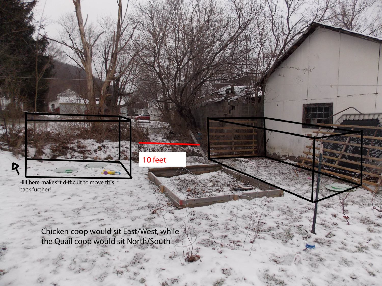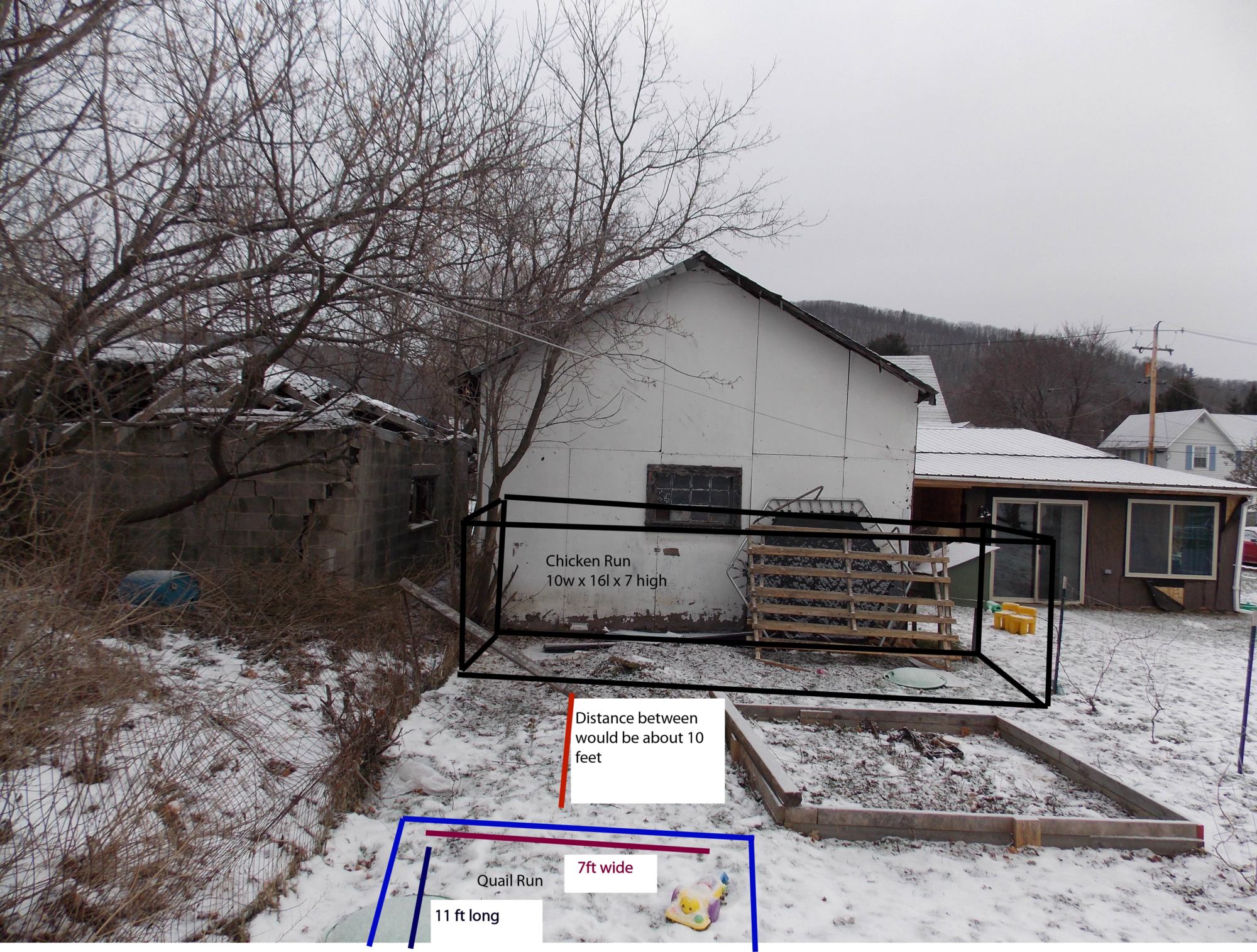 I was thinking about moving the quail coop down beside the garage and further away from the chickens anyway... due to disease. BUT in order to get the chickens far enough away from this property they would have to be about 2 feet PAST my garage. seriously?
