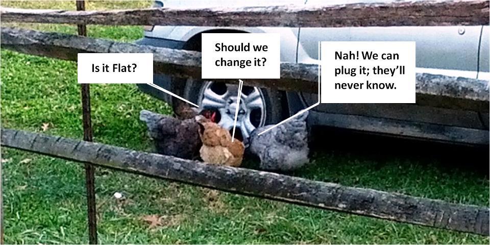 I started jogging down the road, hoping to find a phone or, hopefully, a jack. After 20 minutes (I guessed 4 miles or so; I'm an optimist) and not a single house in sight, I turned around and headed back, hoping that help lay in the other direction. When I finally returned to the car, I saw my lovely wife was sitting on the fence with tears in her eyes.