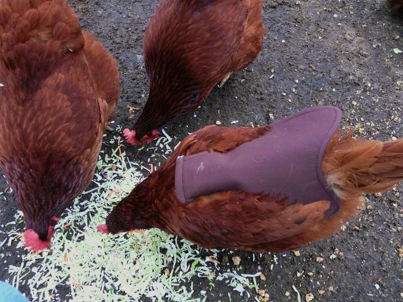 I bought some chicken saddles for them (appropriate sizes at that) and they don't care for them at the moment. I'm curious to see if anyone else has used chicken saddles and has had a similar experience. Do they eventually settle down?