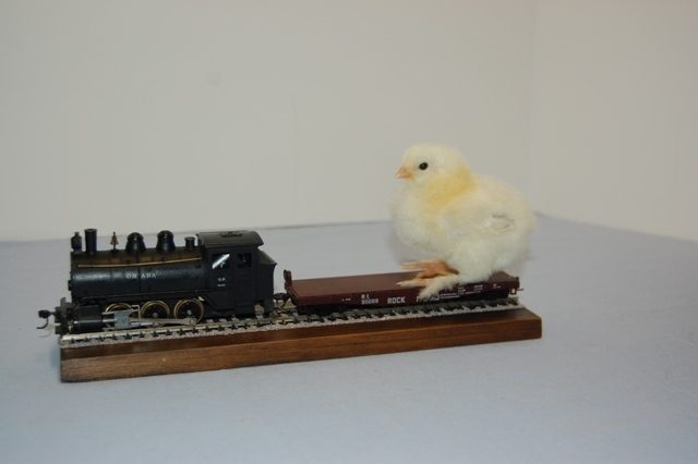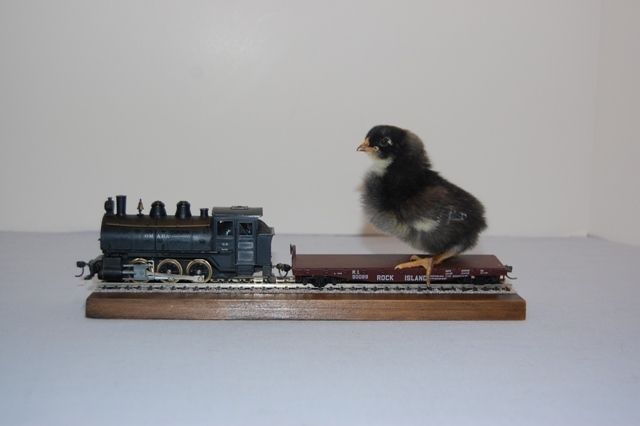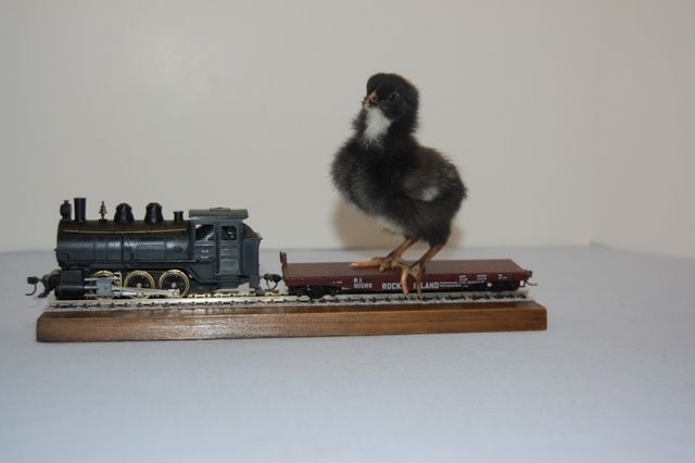 My b/f has been singing the Ozark Mountain Daredevils' song "Chicken Train" since I decided to finally get chicks. Yesterday he borrowed from his father's model train set and had me take some pics: This is Dumpling: This is Omelet: And lastly we have Potpie: Chicks sure are fun.