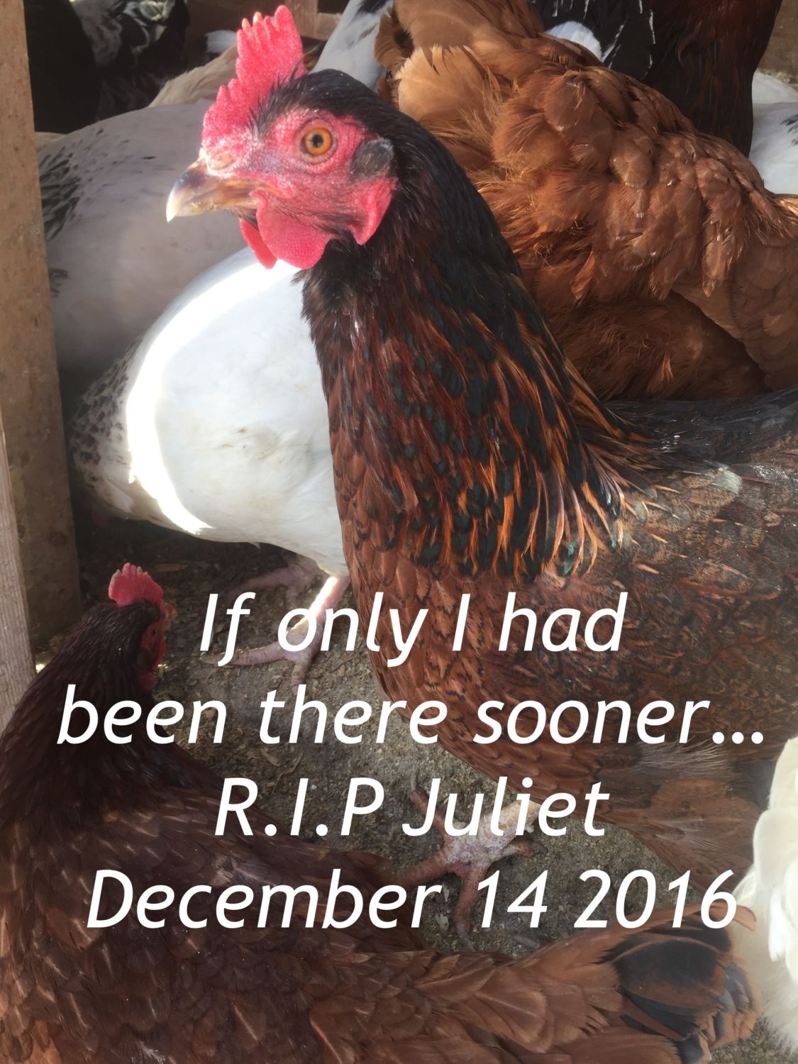 I'm so sorry!I have some very sad news.So I was heading outside to check on our chickens so I went down and I saw about 7 chickens in the snow paralyzed with fear. I was getting worried at that point so I went down the the coop and the sight that I witnessed was one that I wish I would forget. In front of the coop was Juliet ripped apart by horrible, horrible claws. So I ran up to the house crying and my mom went down to the pen to see what happened and I was afraid that it was a raccoon and it had killed most of the chickens. But my mom came up and said that it was only Juliet but it was such a cruel and horrible death. We are pretty sure that it was a hawk and we haven't had a problem with a hawk in a couple of years.R.I.P Juliet. I'm so sorry. I love you...![]()
