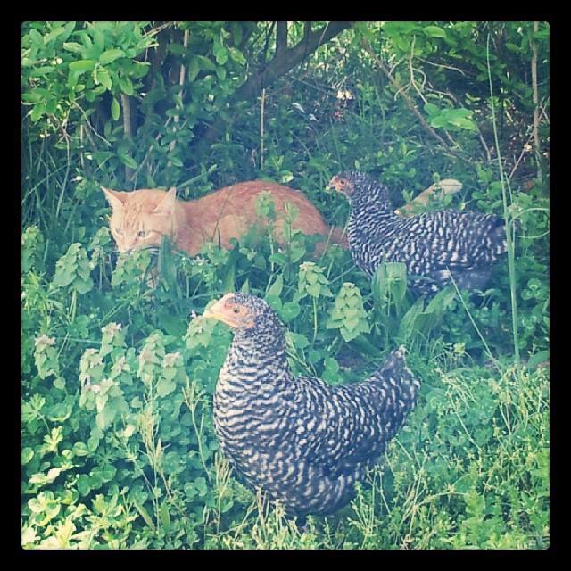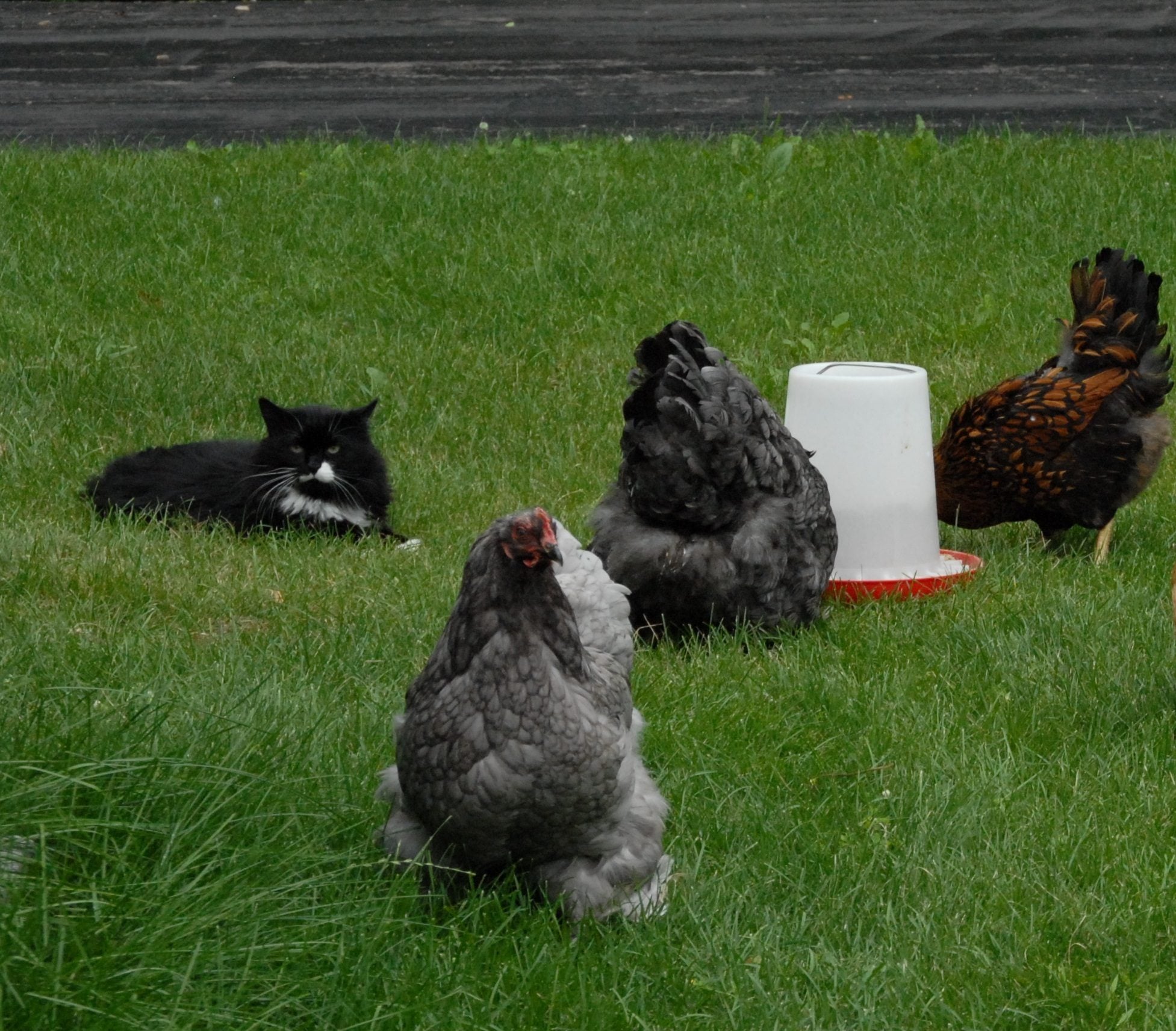 They visited daily, supervising my care and feeding of the new chicks. It worked for me and my animals, and the result is dogs/cats and chickens living in harmony. In fact, the cats babysit the chickens when they are free ranging (I babysit them as well as they are still young).Let's see your photos and hear your stories about your chickens and their non-chicken companions!