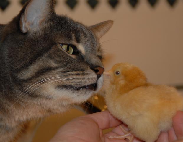 They visited daily, supervising my care and feeding of the new chicks. It worked for me and my animals, and the result is dogs/cats and chickens living in harmony. In fact, the cats babysit the chickens when they are free ranging (I babysit them as well as they are still young).