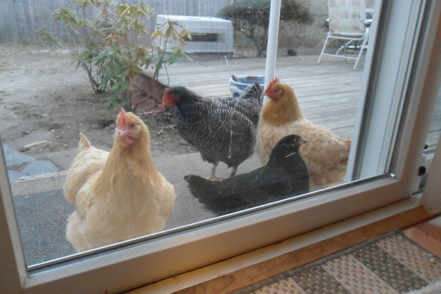 Today when I came home for lunch, we went out the patio door into the back yard and there were three piles of what was obviously chicken poop near the patio door. We laughed, and I told Mrs. Hodawg "well, it probably won't be long that you'll look out the patio door and one of them will be pecking at the door and wanting to come in." It was a humorous joke, and we figured that it may happen sometime in the future. Boy were we wrong.
