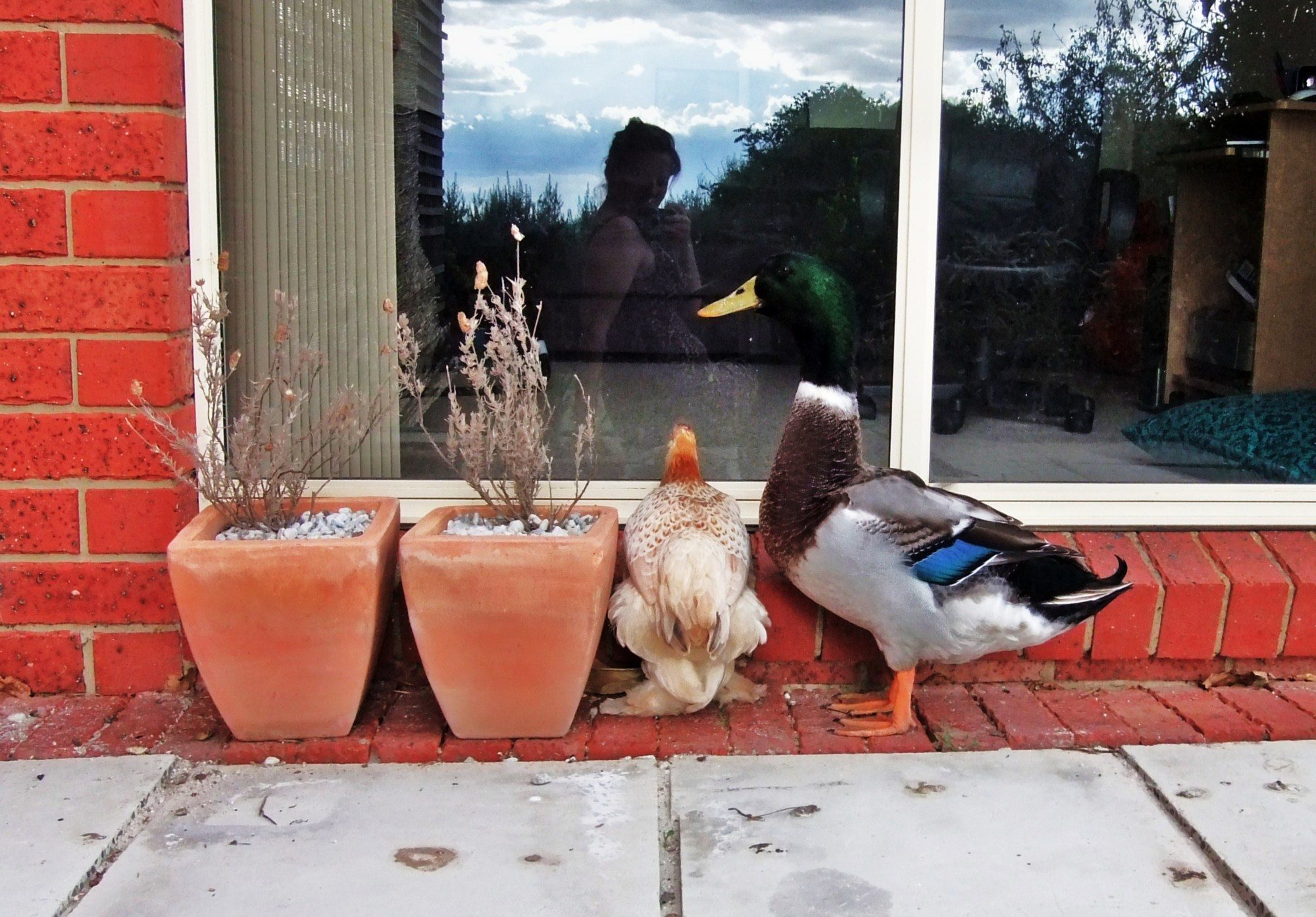 "Tootsie and Gladys are pecking at the patio door wanting to come in or for me to come out.!"