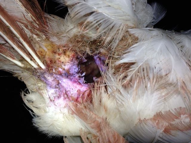 This chicken has what I think is yolk, around where the vent would have been. Although the others were so covered in blood that we couldn't see anything. (This chicken was dead at least 3 hours before we found it, the others were still "fresh" when we found them) I can't seem to capture it in photos, but I can see at least 2 separate yolks down inside of this chicken. We didn't examine the others as closely, because we just thought it was a fluke. Now we clearly have a pattern.