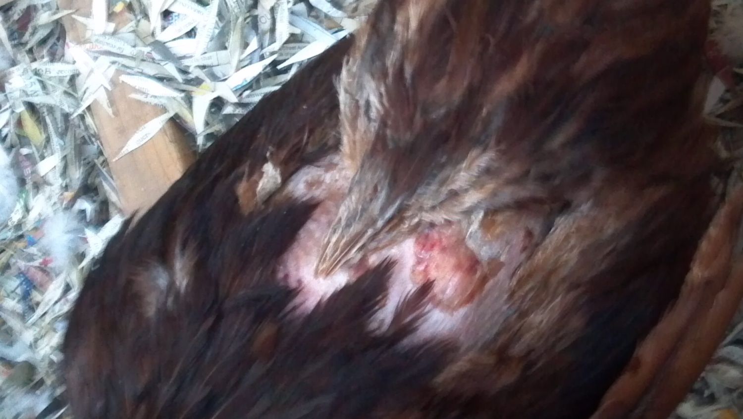 i had 2 chickens and ran to the grocery store. when i came back one was dead in the yard and the other was absolutly terrified ad hiding behind a stack of pallets. they both had been attacks. i took the one still alive in the bathroom and cleaned her odd. all of her tail feathers had been pulled out and most of her back end is skin. i can tell whatever had gotten her got skin but not flesh and she was covered in ants. i rinsed the ants and loose feathers off and put her in her coop/run so she was totally safe we gave her fresh water and some bread and im going to get grapes. a friend of mine said the only things i could do would be wait for her to die or turn her into dinner. dinner is not an option. i check on her every half hour and she is moving around, she is very very scared and now lonely (the other chicken was pretty much her sister since they hatched together) idk what else i can do but keep her comfortable and hpe she makes it.