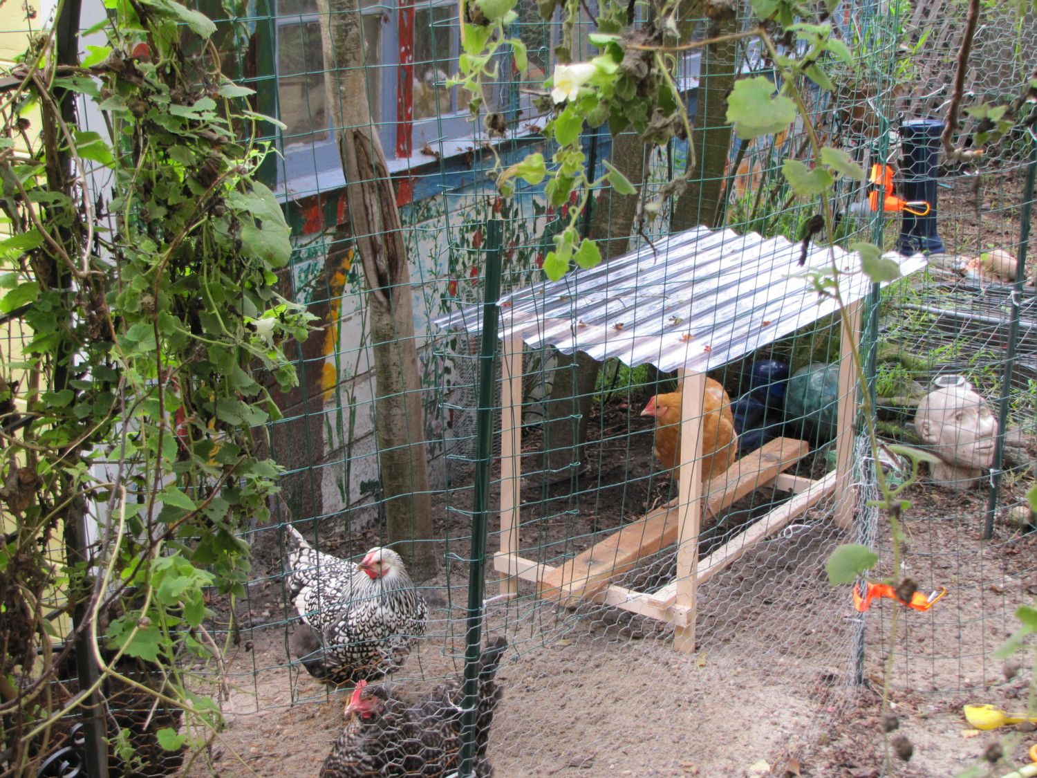 I have spoiled California chickens and it's been interesting to see them go from absolute huddled horror when they first encountered rain at about 5 months old, to now a couple months later they just hang out in it. We are improving our drought with a decently wet rainy season so far this year, and I gave them a 2'x12' corrugated acrylic panel's worth or weather protection. Two thirds of it is covering the open part of their coop (cut in pieces so they get a 4'x4' square of dry area) and the remaining 4'x2' section I turned into a dry perch for them after watching them get soaked in the back part of the run. I built this from scraps of an old Ikea bedframe my dad had lying around (sized about like 1"x2" pine lumber) and a 4-foot scrap of 2"x4" so they each get a foot of roost.