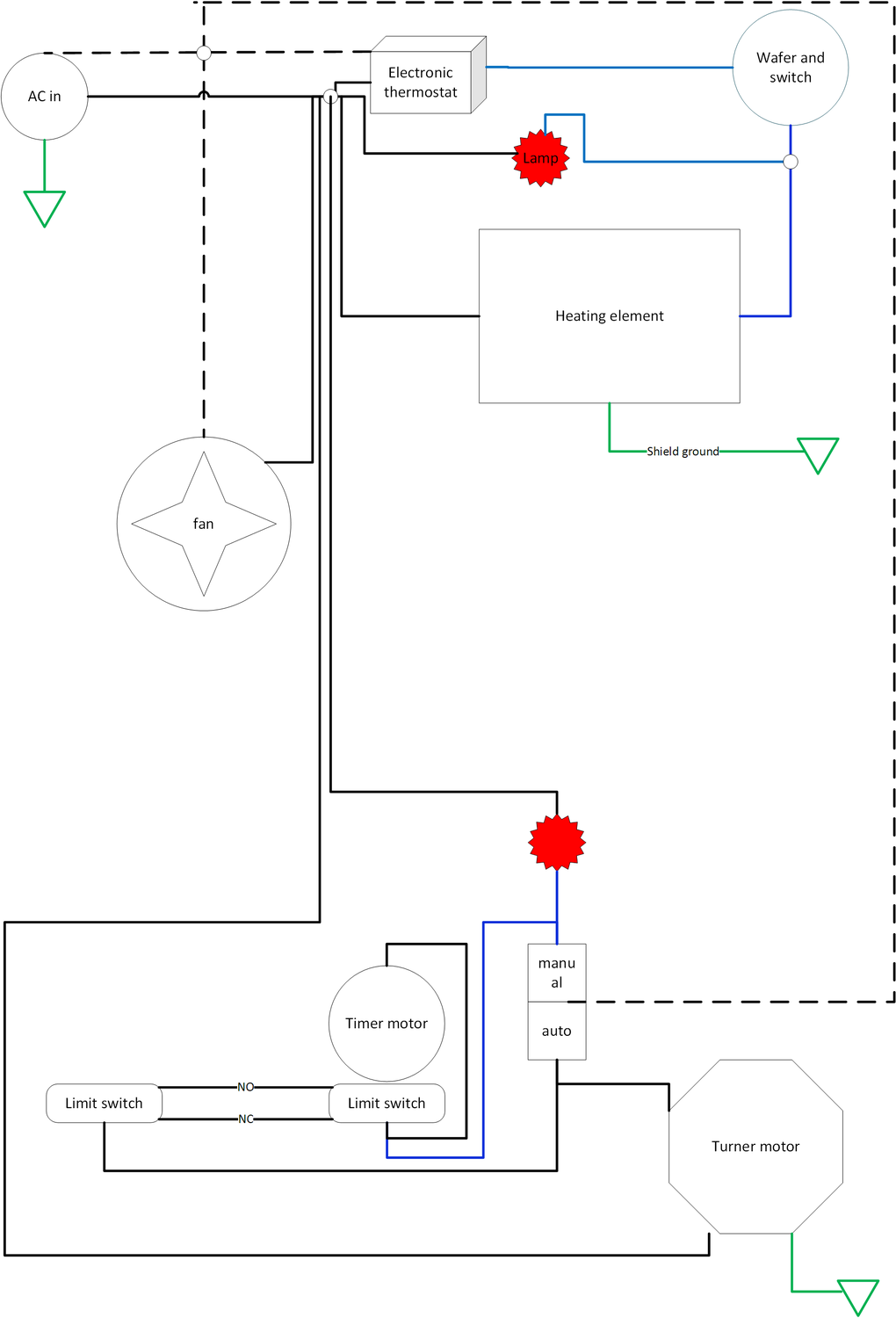 nothing crude about that ..was so busy yesterday didn't have time to do anything but some cleaning. I had to take the back off because I couldn't get the side screws out of the fan support from the front . no bad wires no bad connections every thing looks good . 60 ohms on the element. the thermostat is bad. straight wiring to a cord only 25 ac volts getting through . no way to repair it have to get a new one . . I have stripped all the shelf supports out and resealing the inside . btw this is the hatcher I'm working on first so no turner . but still a pain you must have stood on you head to get the whole assembly out like you did . The model # is 1266 .one of the incubators is just like it . the other is different not as deep and has this wiring . also the thermostat is not the same . it still has the dual setup but is wired different . I think the old style thermostat does not store well.I guess they are like a car you need to start them up and run them quiet often to keep them working well .