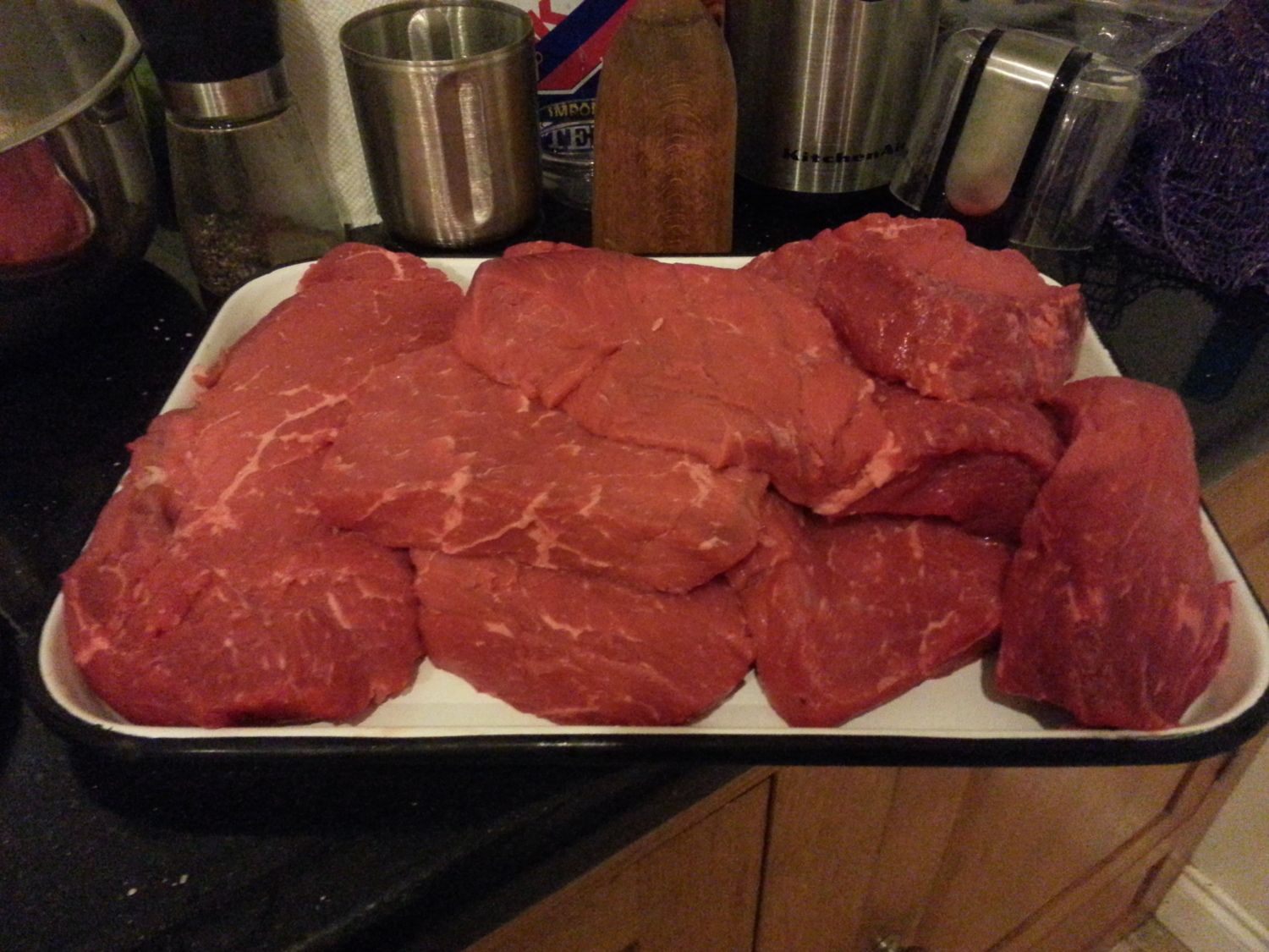 Girls Night In...I really needed this. Hubby's up hunting with his dad, son's at a Halloween party, daughter and her boyfriend went to Niagara Falls ON for the weekend. Just me and the dog hanging out making beef jerky to fuel the next hunting trip, as I got an urgent text this afternoon that the jerky supplies were depleted and they'd have to come home early tomorrow. After a couple days in the marinade I'll fire up the smoker. I also sent up a package of my new breakfast sausage recipe. They ate two days' worth this morning, so I got a few pork butts to make some more.