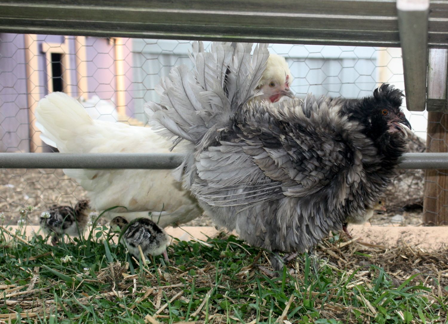Two of my girls decided to go broody a few weeks ago. I do not need any more chickens or chicks, so I gave them 5 bronze turkey eggs from the incubator. I had humidity problems and lost all that were in the incubator, but the girls hatched all 5 of theirs. I'm going to let them raise them as well. My 2 girls shared the broody nest and are now sharing the mothering duties.