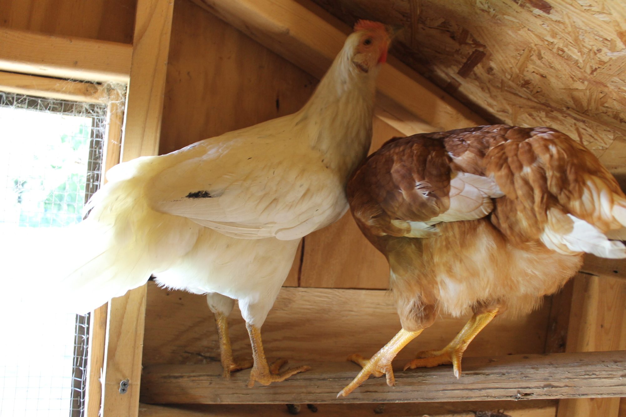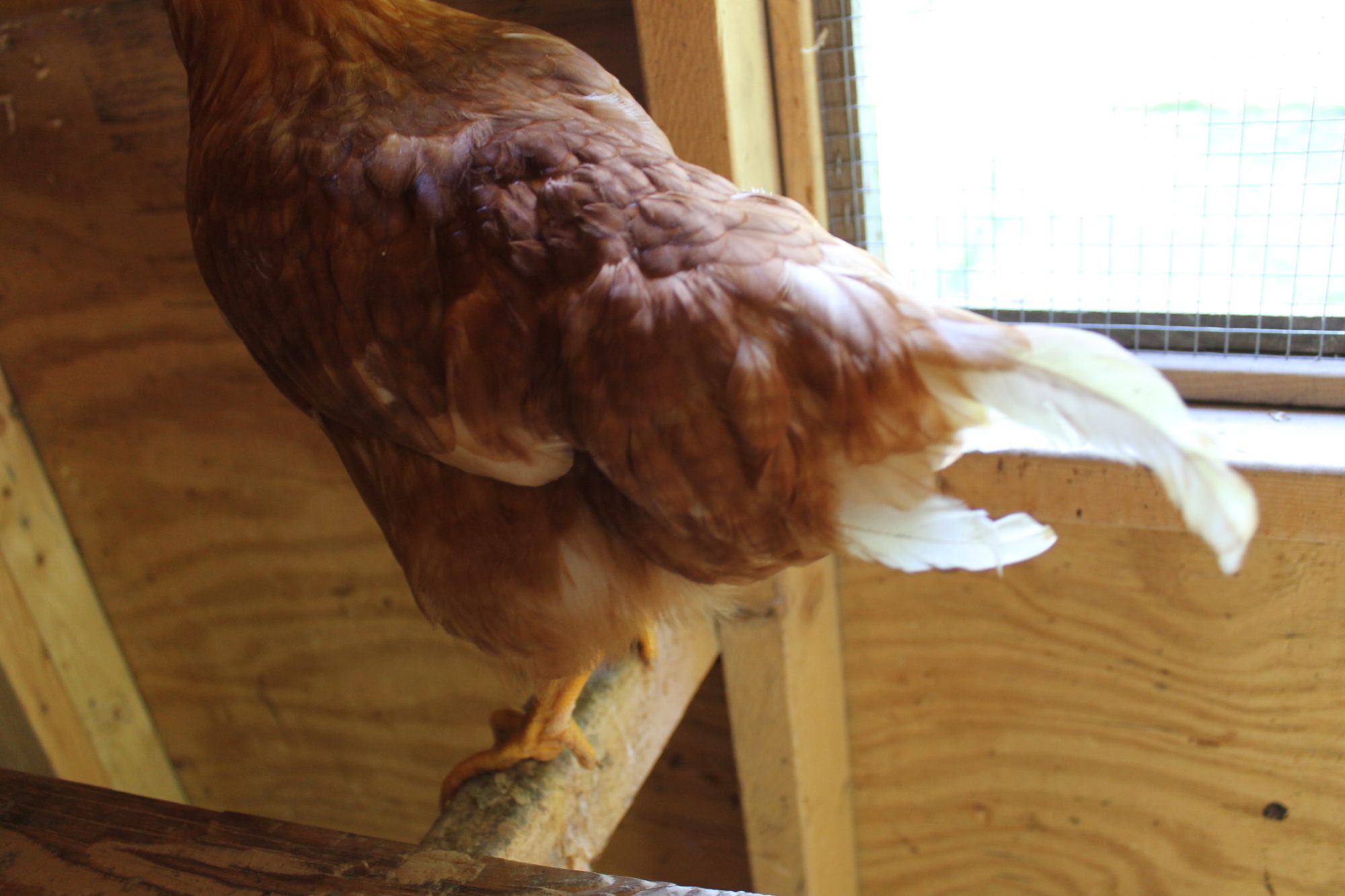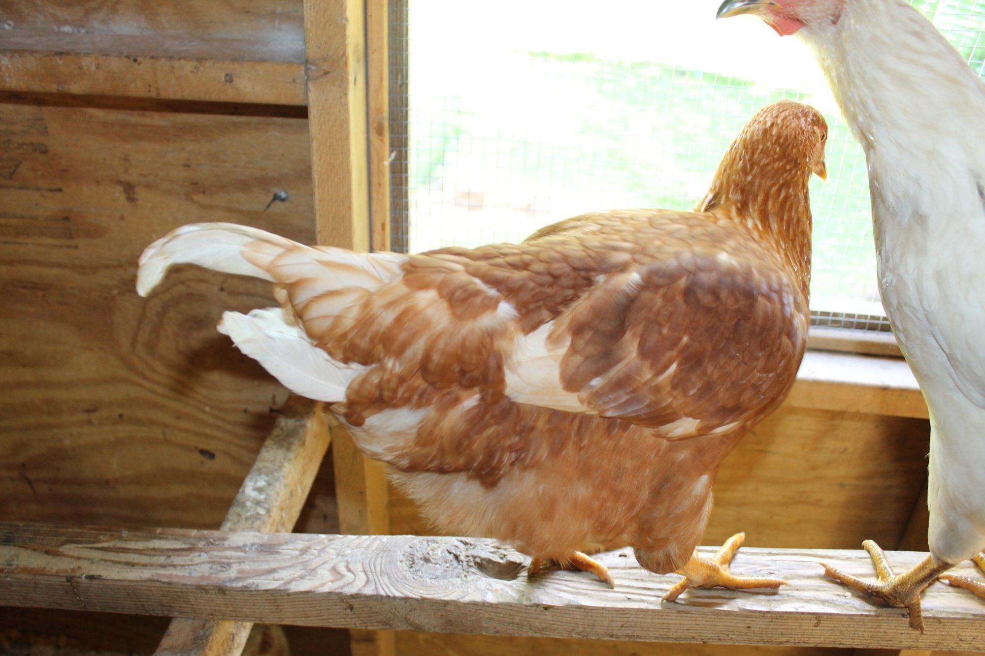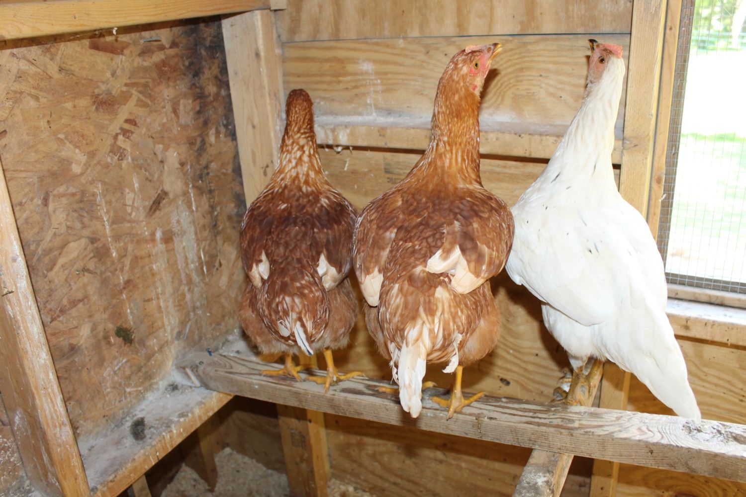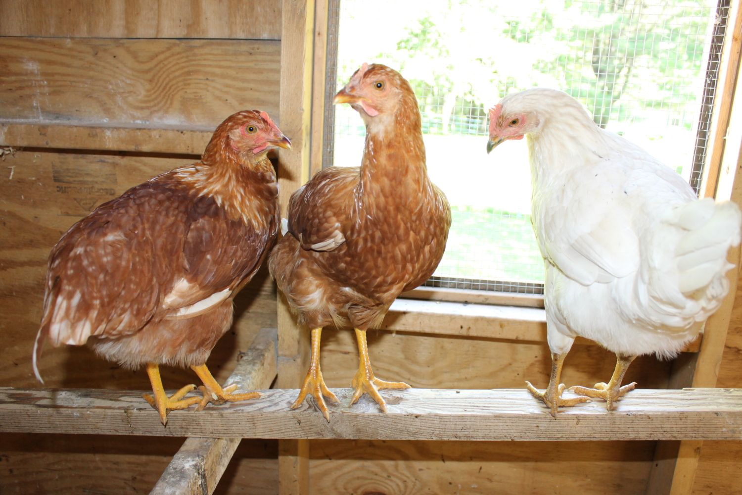 So, I had three wayward chickens show up at 4 am a few nights ago. I have no idea on age, but I am guessing they are between 12-14 weeks as I currently have 10 week old pullets who are a bit smaller and they are a couple inches shorter than my 1 yr old hens. I am thinking that there are two red sex links and maybe a white leghorn? The white is a little smutty. I was thinking that they were pullets, but the reds have some long tail feathers sticking off. If they were cockerels though, I thought that they would have much more white if they really are red sex links. They are very sweet and quiet. I am torn on everything: age, sex, breed. Any help? Thanks!!