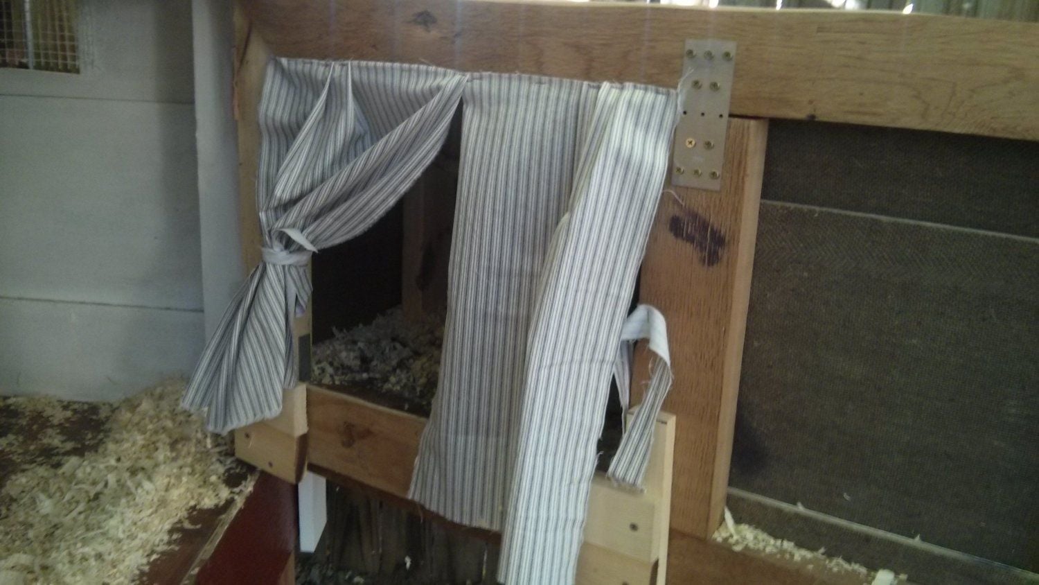 I built a roost, which is about 12" off the floor. It is about 3.5" wide. One section is about 22" long. The other is about 10". I rounded off the edges. I read that I should try blocking off their nesting box at night, so they are forced to sleep somewhere else. I did that for about a week. There was only one night when I actually saw one sleeping on the roost. I had to stop blocking the nesting box because I forgot about it a couple of times, and they didn't have access to the box for entire days. There is a curtain on their nesting box, but all four still squeeze in there every night.