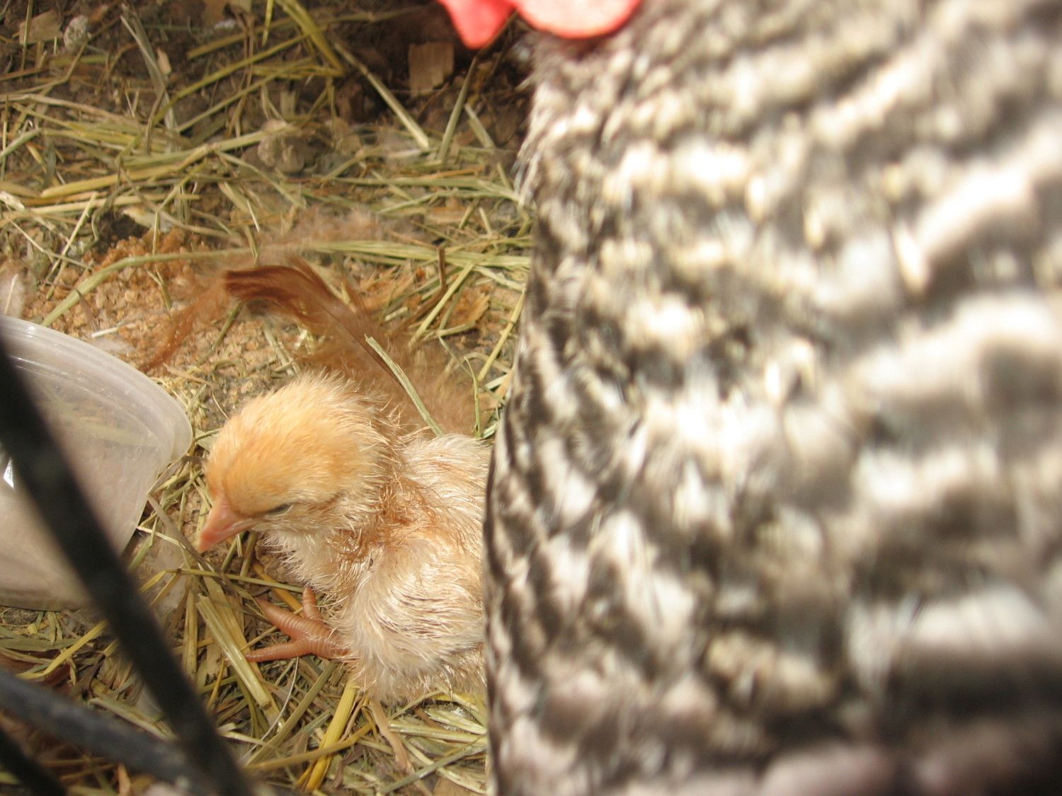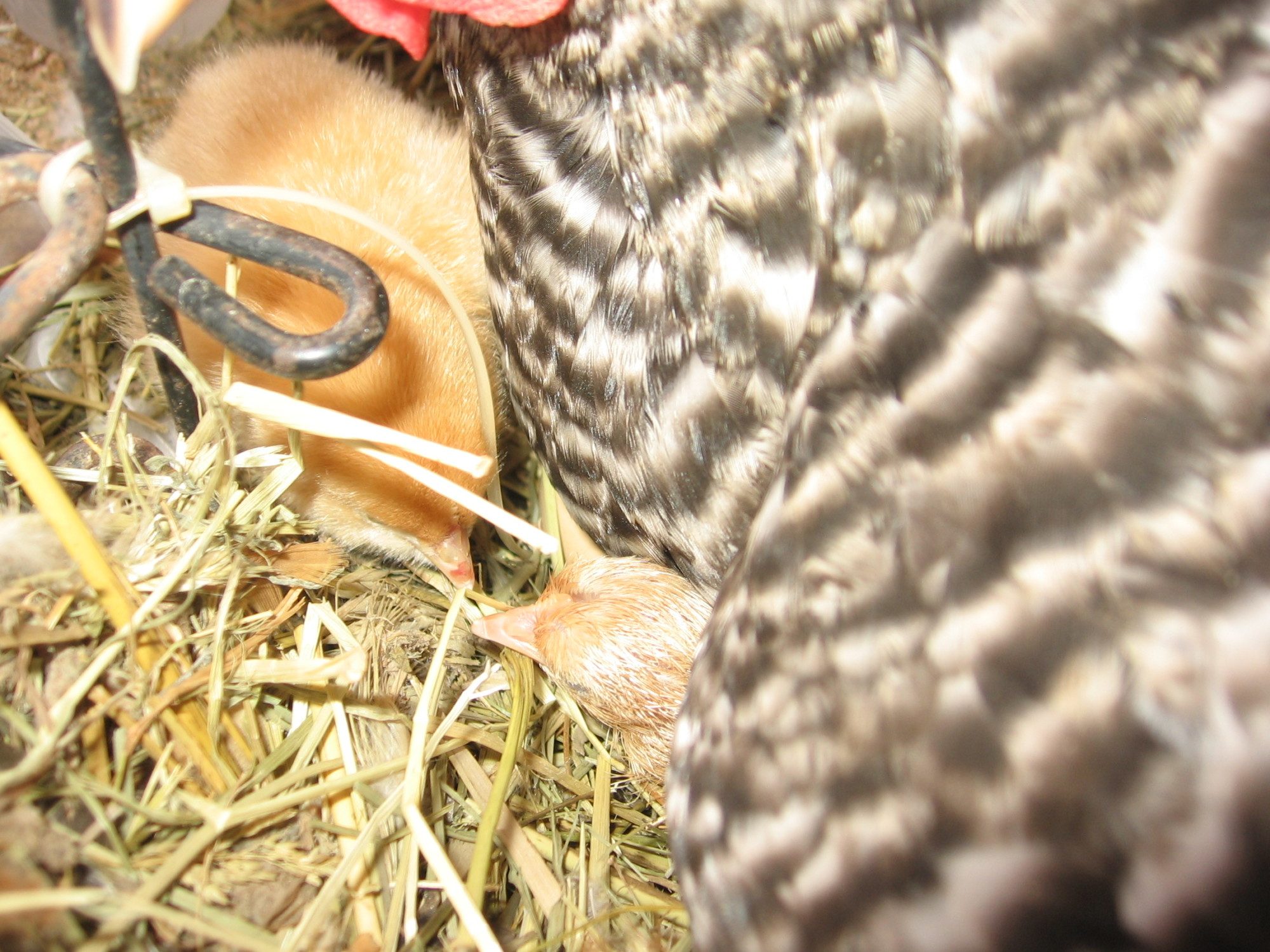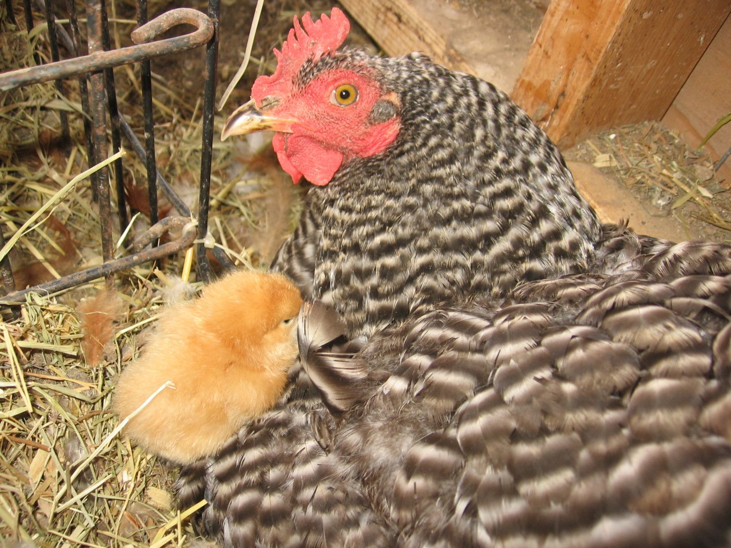 The momma hen will take care of the chicks and squat down to let them run under her for protection or to keep warm and she will call them to run for cover if theres danger or call them to eat.She will sleep with them and everything.What kind is she?