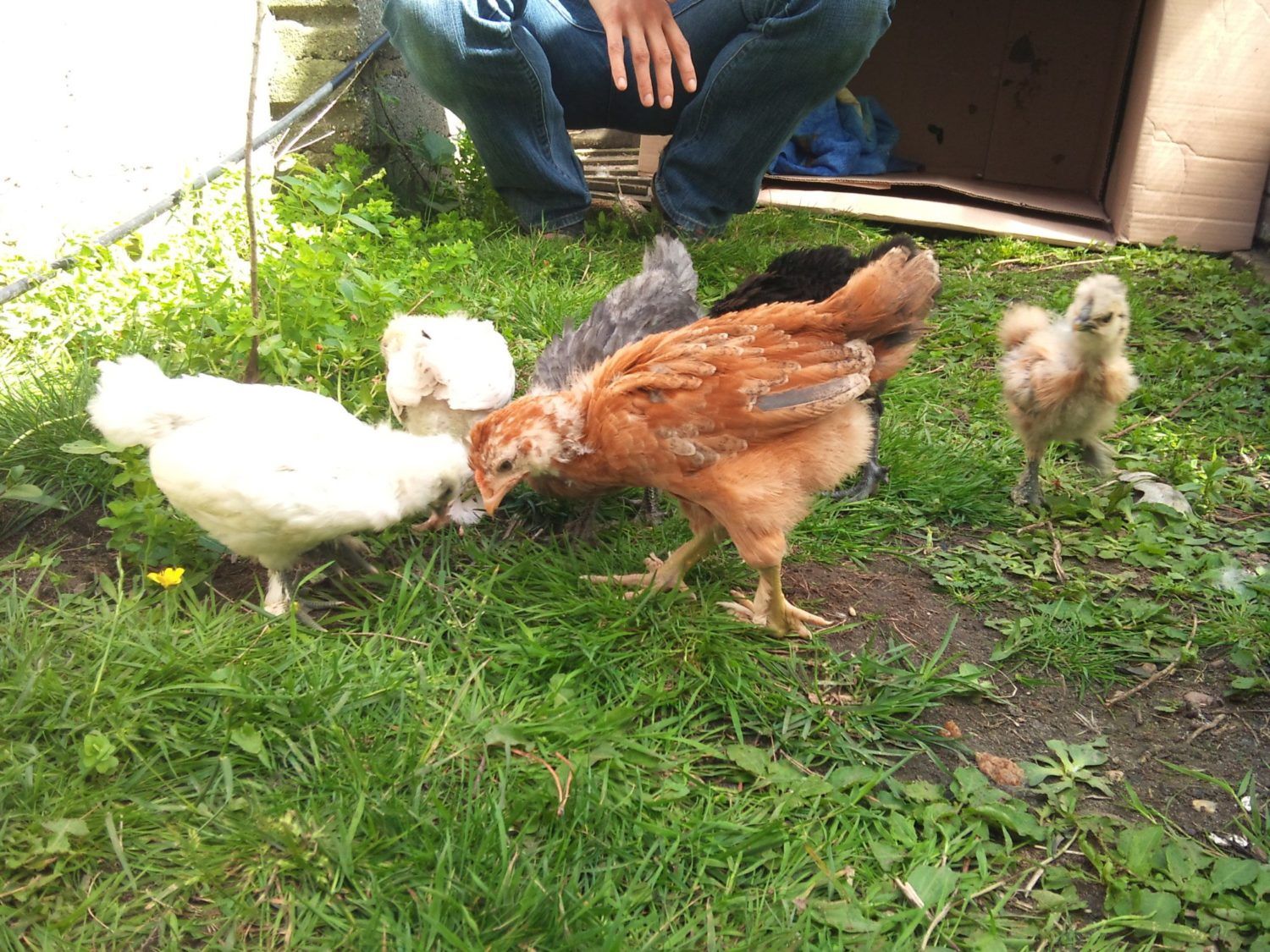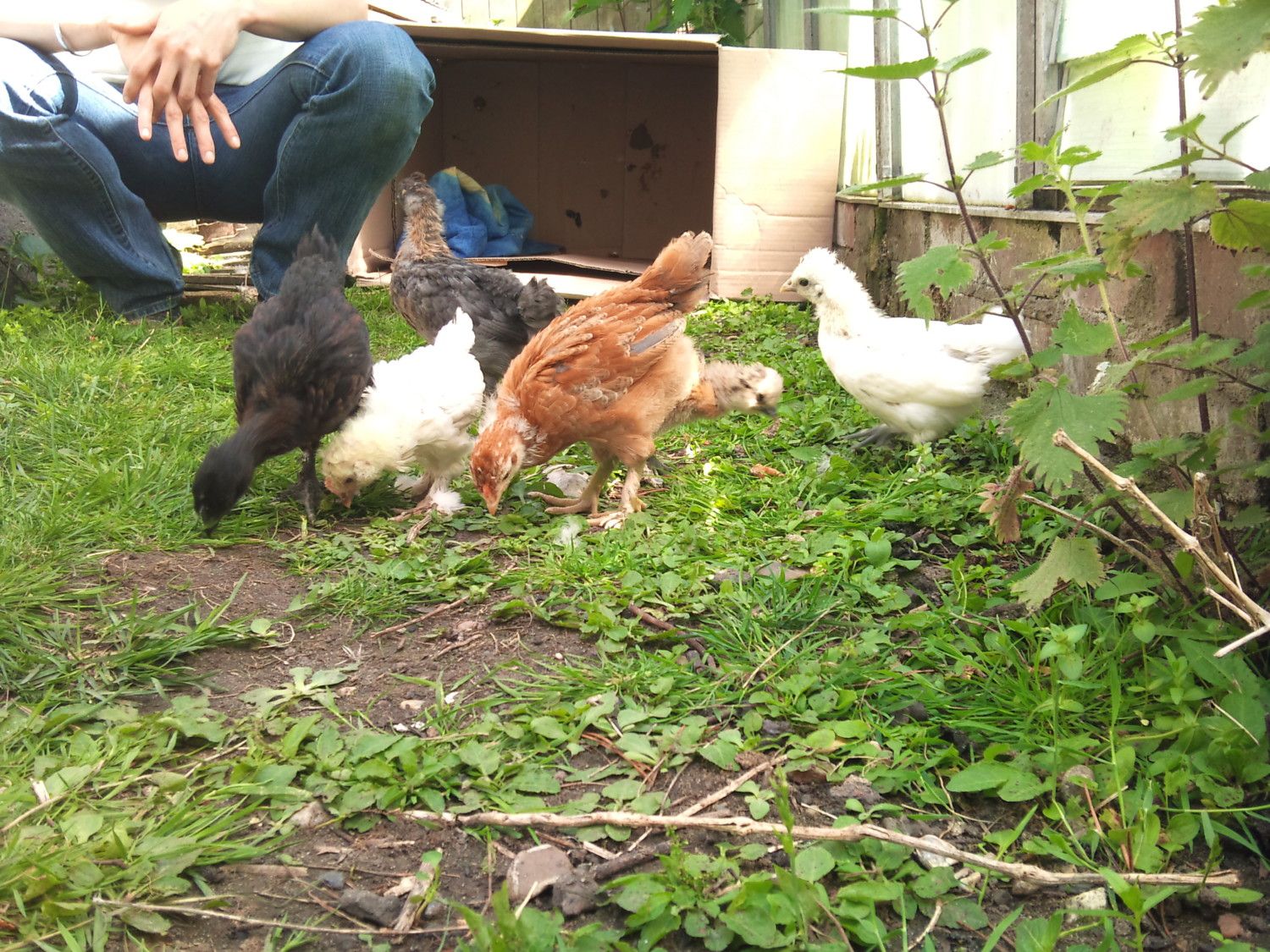 Here's our 6 chicks in the garden for the first time-they are our first batch from our own chickens! think theres more than a couple of roos though....They're all mixed-3 larger are silkie/maran/other mixes and the 3 bantam are 2 silkies and a polish/pekin