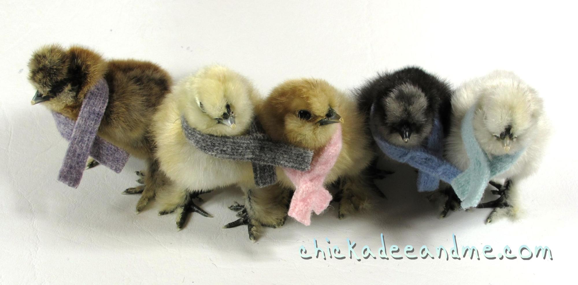 Haha, they probably would have fit better on naked necks. My silkie chicks have extremely puffy necks! I thought they would be tossing their heads all around, but it actually seemed to calm them when I put the scarves on, go figure.