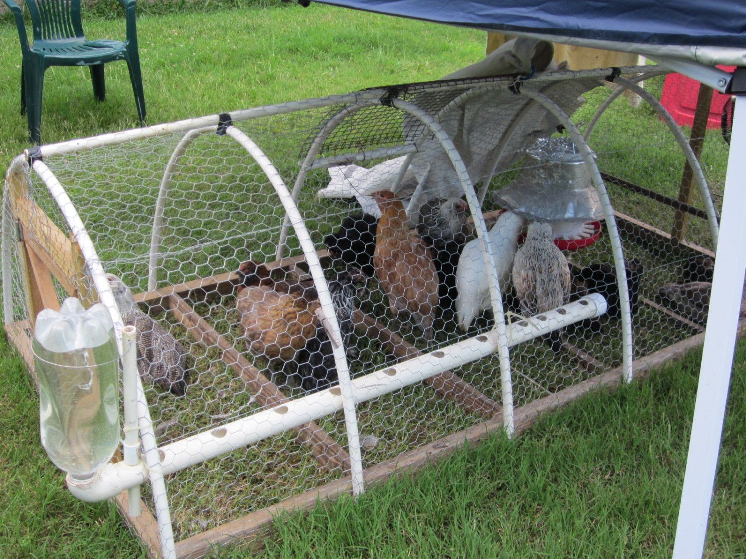 Yes. My husband reinvented the chicken waterer. Here is a pix of the new waterer. It consists of a piece of plastic pipe about 1.5 inch in diameter x length to fit your situation. Must trim away the plastic shavings so the chickens don't eat them. Put a plastic screw clean-out plug at the far end. Use a large elbow at the water supply end. Gatorade bottles are more substantial than soda bottles. Install one vertical 1/2 inch pipe next to the bottle. Use plastic ties to secure pipe to the side of the cage/wall. Note: pipe must be level or the water will empty out albeit slowly. Fill bottle, invert into elbow. This should not be a tight fit.Like a dog waterer, more comes down as the chickens drink. The nipple waterers are good but you need special tools to put them onto a pipe. I flush this about every 7-10 days. During freezing weather, open the clean-out fitting and the water will drain out. We will install the nipple type inside the chicken house using heater tape to prevent freezing. Note this coop has not floor. We move it to a new spot every 24 hours to a new patch of grass. After 7 days the grass returns to normal and is fertizlized. Note the feeder. Use Harris farms feeder (10 pounds) with bonnet over feeding area. Keeps birds in feeder, keeps rain out and keeps birds from climbing on feeder. Use pie tin for a top. Birds will eat aluminum foil. Absolutely no waste of feed using this feeder!