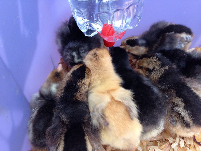 DH was the one who got the package from the PO and put them in the brooder, so I had to explain to him he had to tap their beaks on the waterer to make sure they got it. Oh, they got it. They love the nipple drinker.