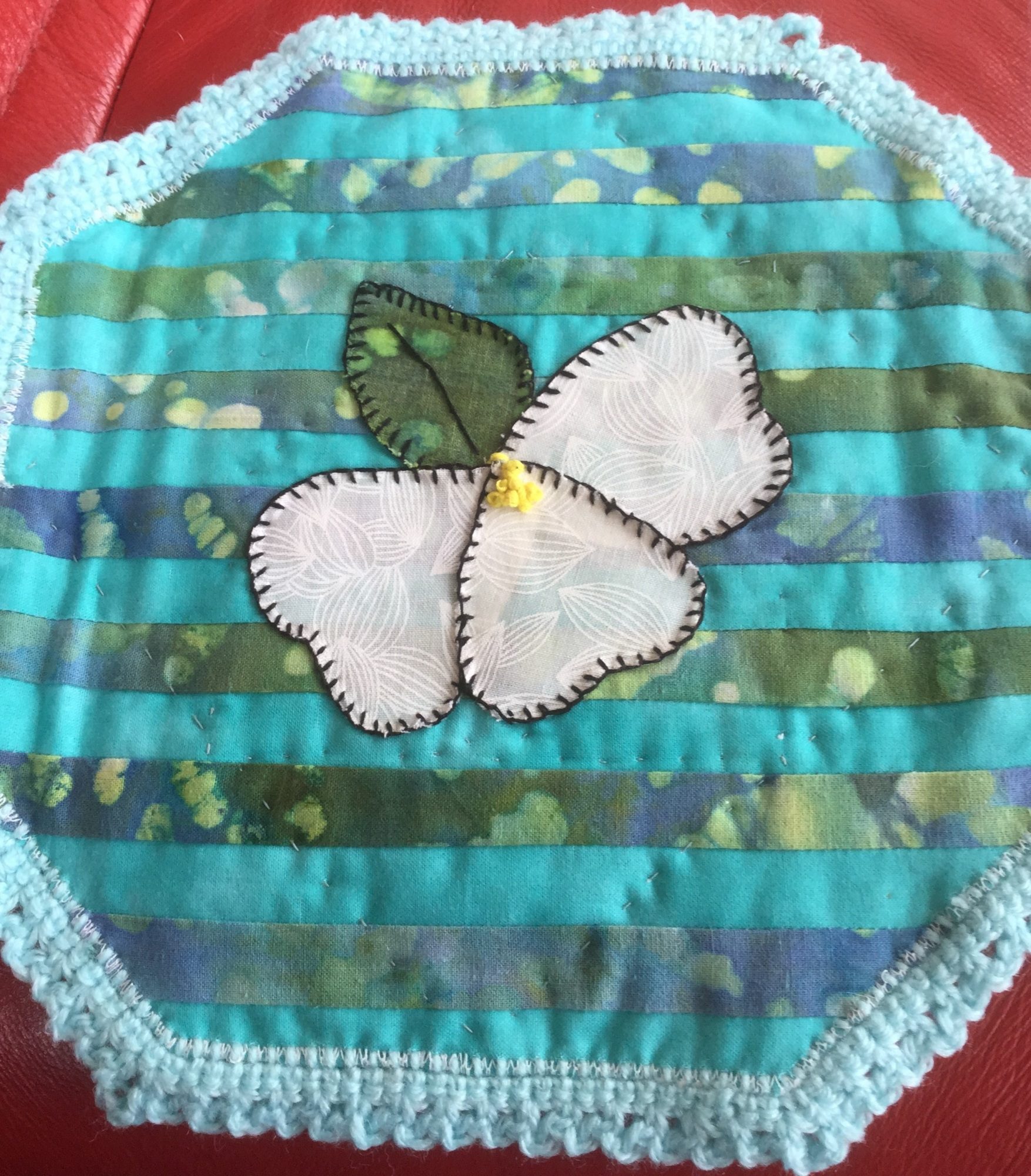 I am so glad that it made it there! I tried to track it (my postmaster said I could until it made it to the UK) - "no information available" is all I got. I was beginning to worry that it was already lost before it started its journey across water. I had fun doing the crocheted edge. I wanted to add something that would look nice to off-set my terrible hand-quilting....and I had light weight yarn that matched. I'm glad you like it and the bit of fabric that I sent with. I love orchids too, however I can't keep them alive worth beans!![]()