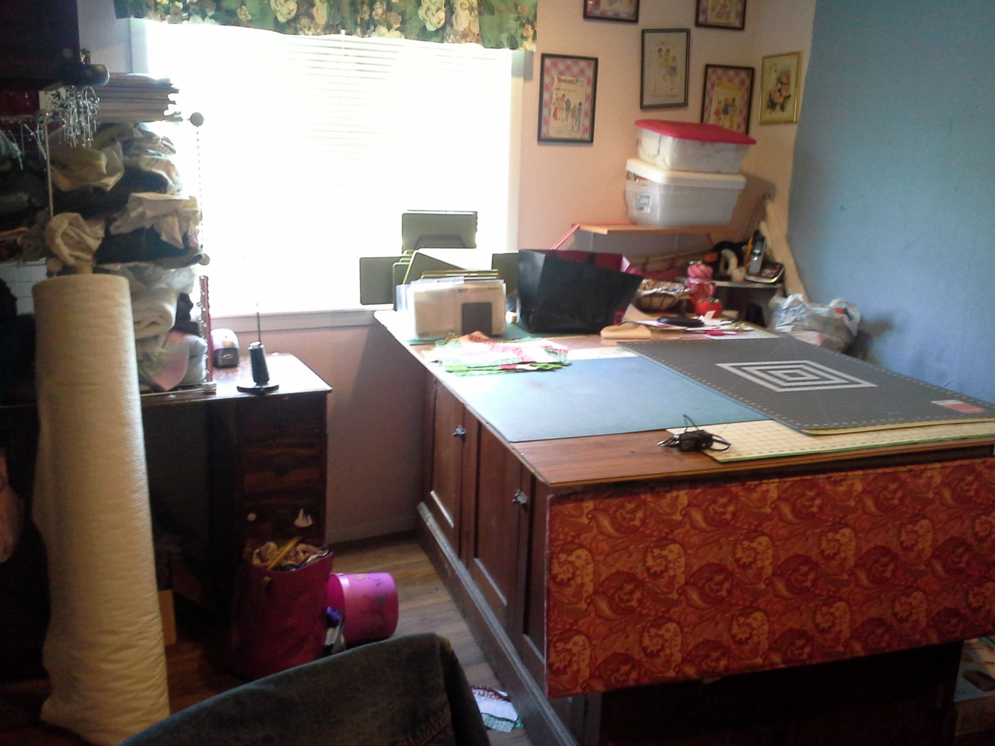 I like that set up! I like the ironing board fold down. I want to add a display board on the wall to attach quilt blocks, also. Another option to add to my plan! Thank you so much kelsek!OHhappychicks. I want to share my sewing room with you. My cutting table is a God send. We found 2 old cabinets (was told that came from the chemistry lab) at a flea market. My dh cut the tops off added costers and we used floor laminate for the cutting surface. I recently added and fold down ironing surface to one end.