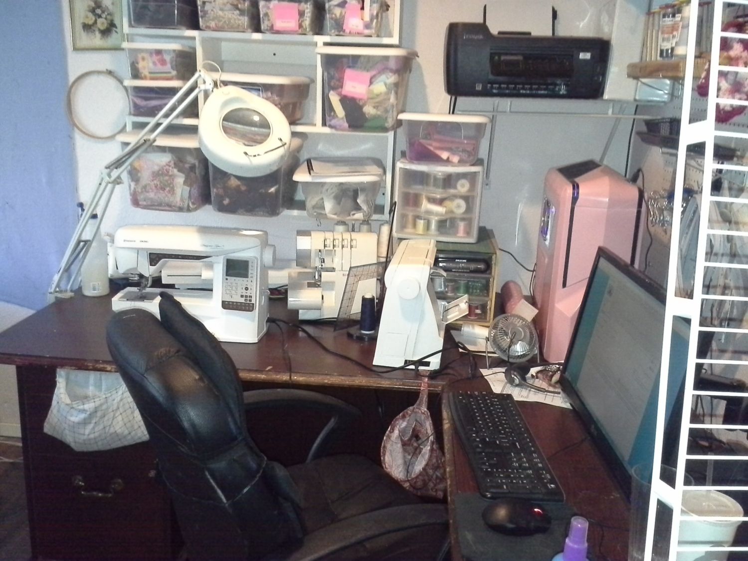 My machines sit on a secretary desk and because of the size or desk and CT they are close and I can just turn from sewing to ironing. It is amazing. Thank you DH. Love it.![]()