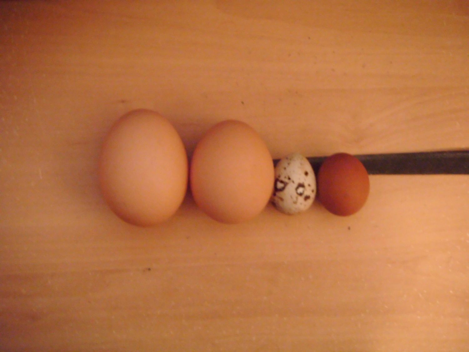 The smallest dark brown egg at the end is "little ones" first egg compared to a quail egg and few more eggs.