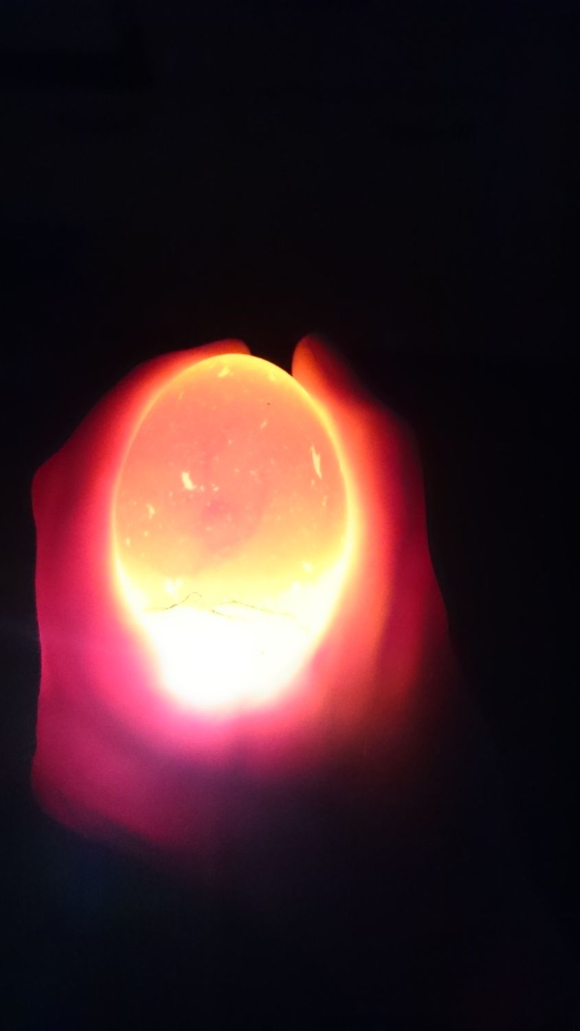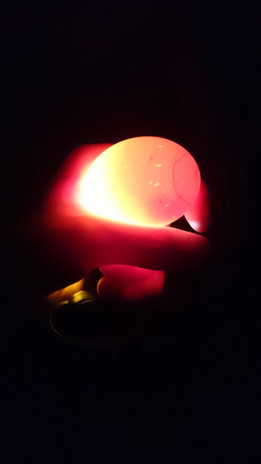 This one has two interesting spots. Not sure what they are, kind of far apart. Please, no twins. I don't want to/ can't/won't do an assisted hatch on my first round though. This egg is not speckled.