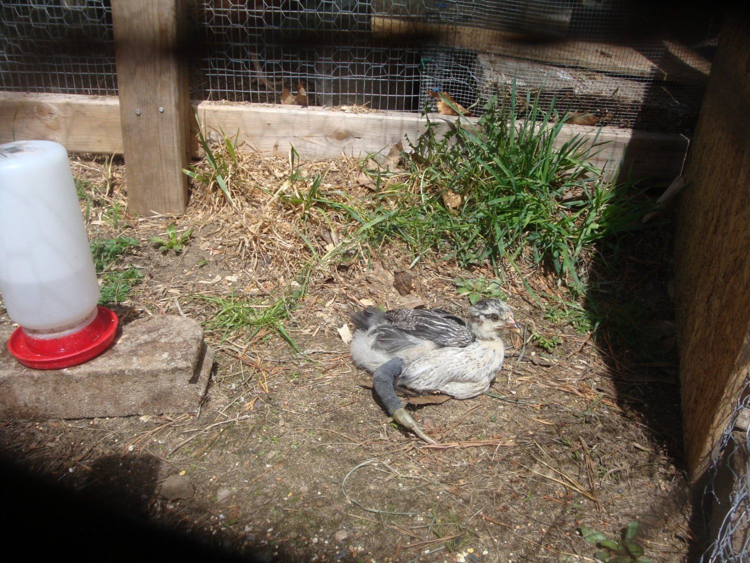 She seems to do best in a figure 8 wrap {vet wrap} on that leg, I've tried various things. I separated her from the brooder of 7 and she's happy in a brooder with only two of her sisters, who I named Isis and Anubis. They were the most mellow of all the others and have proven to be great friends for their handicap sister.
