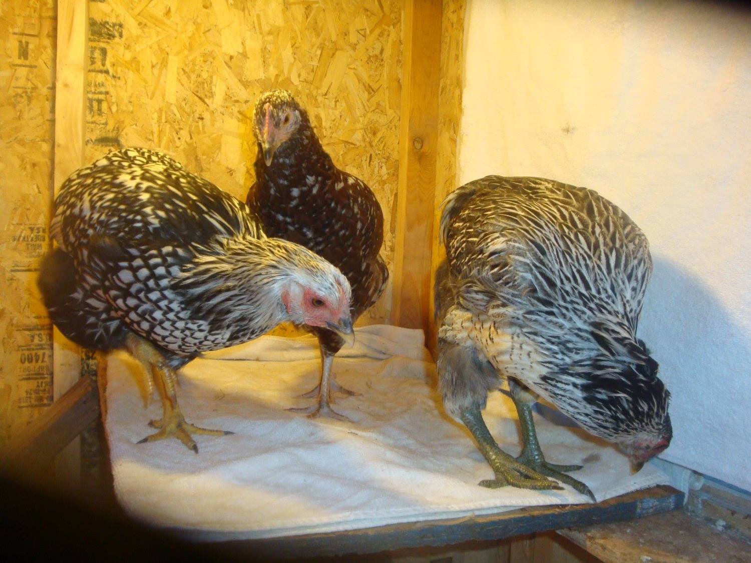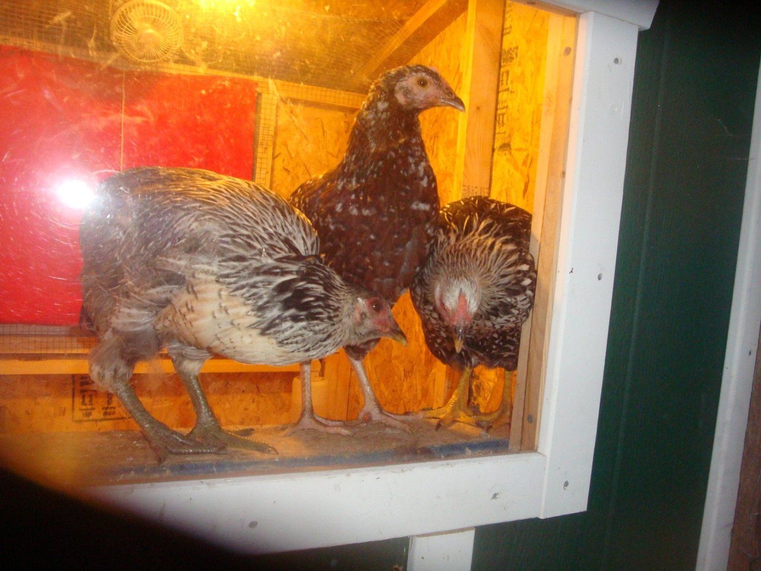 Cleopatra on the left, Anubis {speckled sussex} in the middle and Isis {silver laced wyandotte} on the right.