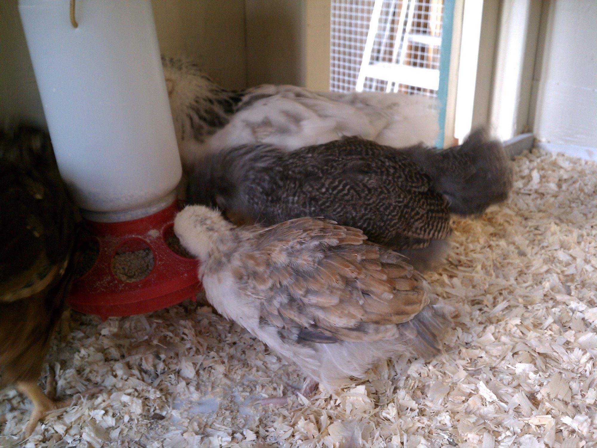 -When she was around 3 weeks old we picked up another chick from the feed store. About a week later we moved them into the garage. Around the same time she had her first trip outside. After moving them into the garage we noticed she spent most of her time fluffed up and cold looking. She always has eaten and drank plenty, however she does sometimes get pushed out at the feeder. She is pretty good at getting back in there though...