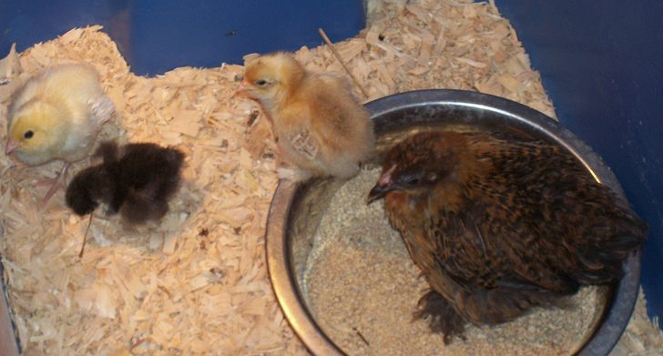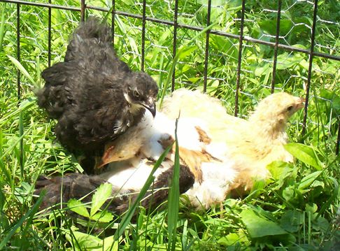 The older pullet (I am assuming since there is nothing telling me otherwise) was in another brooder tub. She kept jumping out. The last night she jumped out she was trying to jump into this brooder tub so I put her in it and made my husband babysit since his computer is right beside it. She has been mothering them! Even with a heat lamp and panting her butt off all day, she hasn't tried leaving the brooder at all. She is from Cadeau and for a lack of a better description, her babies are my miracle babies - BW/W Am, black bantam Cochin and the full sibling to the 'BC' pullet in the above pics.