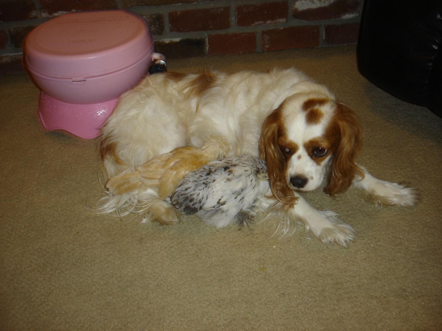 Edward, my Cavalier King Charles Spaniel with a cochin chick and a polish chick snuggled up for a nap. He was annoyed that I woke him with my picture taking.