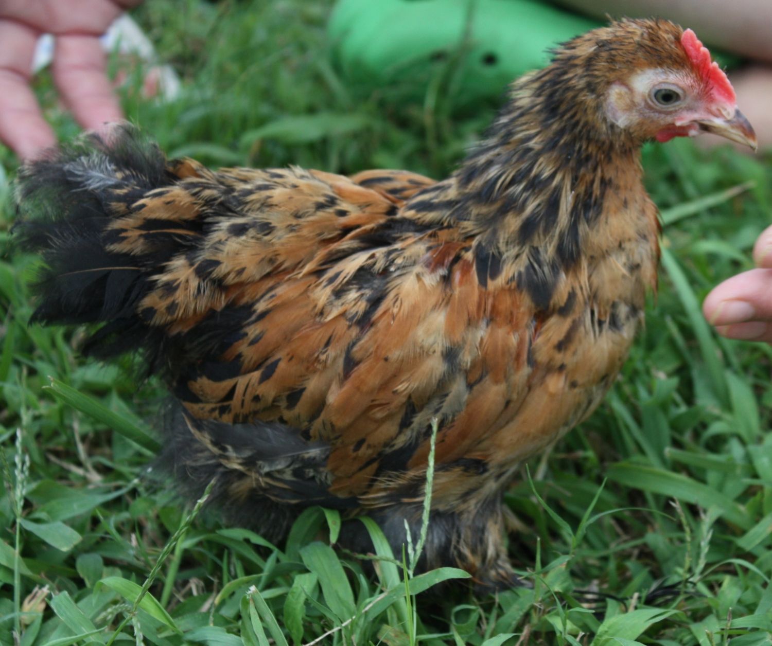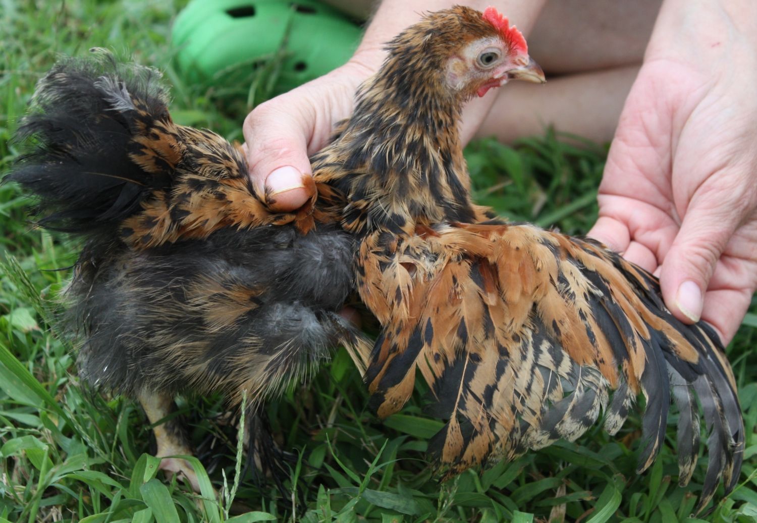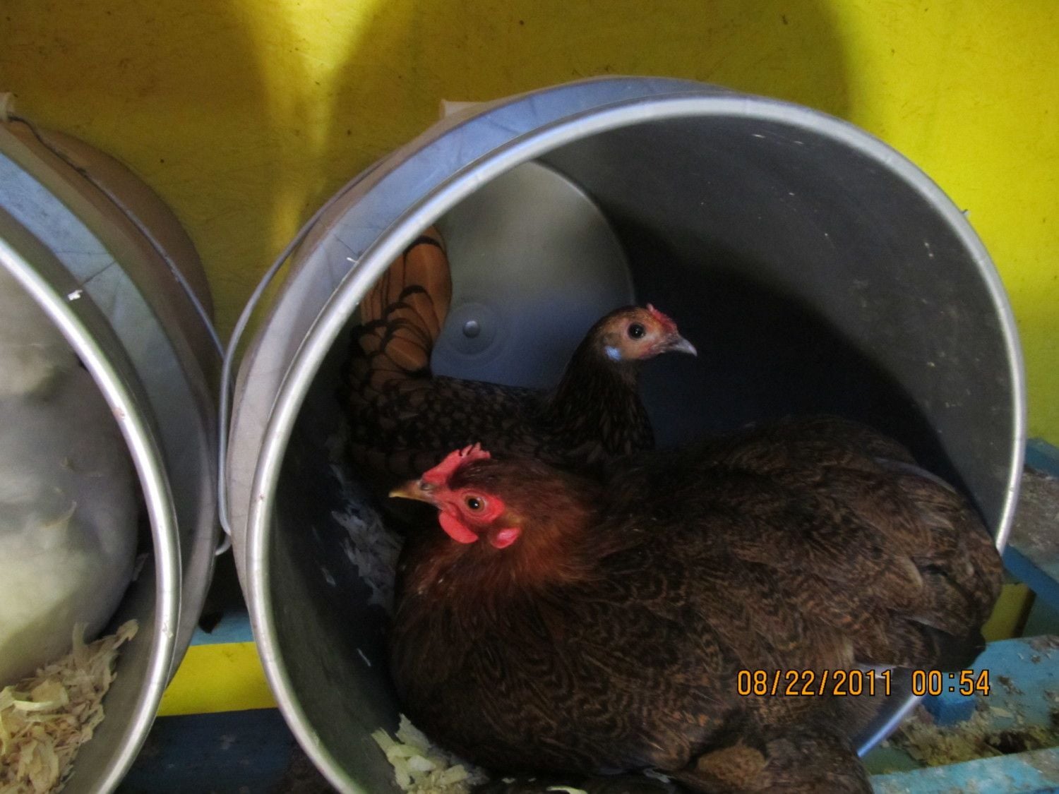 Daisy is in the front. Her friend Tala is in the back. Tala is the only chicken she will share with. But Daisy still doesn't look very happy about it.