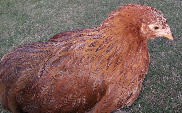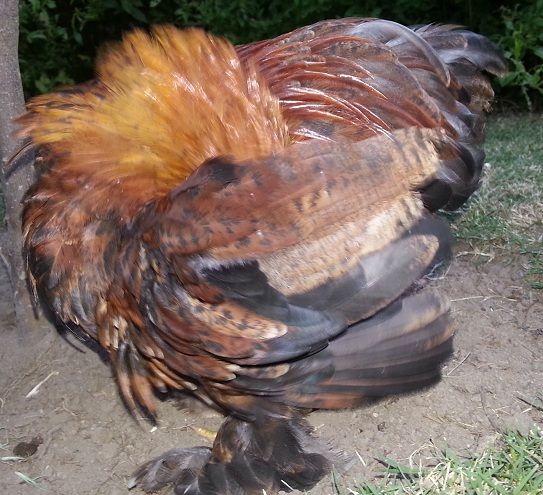 I found a potential partridge rooster for my laced project. He has good foot feathering, but also has white spots on his head, and white/grey under feathers in his tail. I can see the saddles coming in a nice mahogany red.