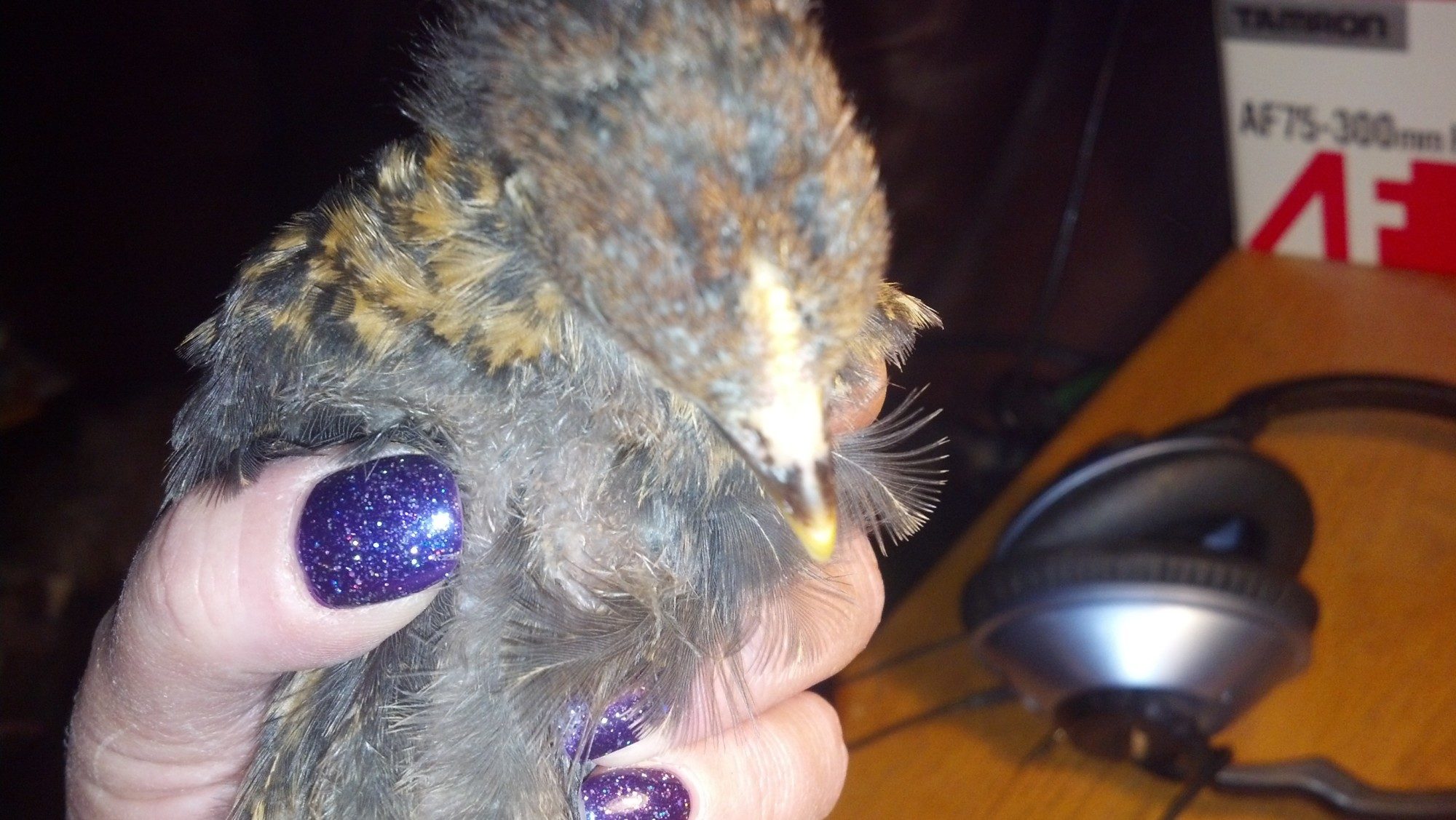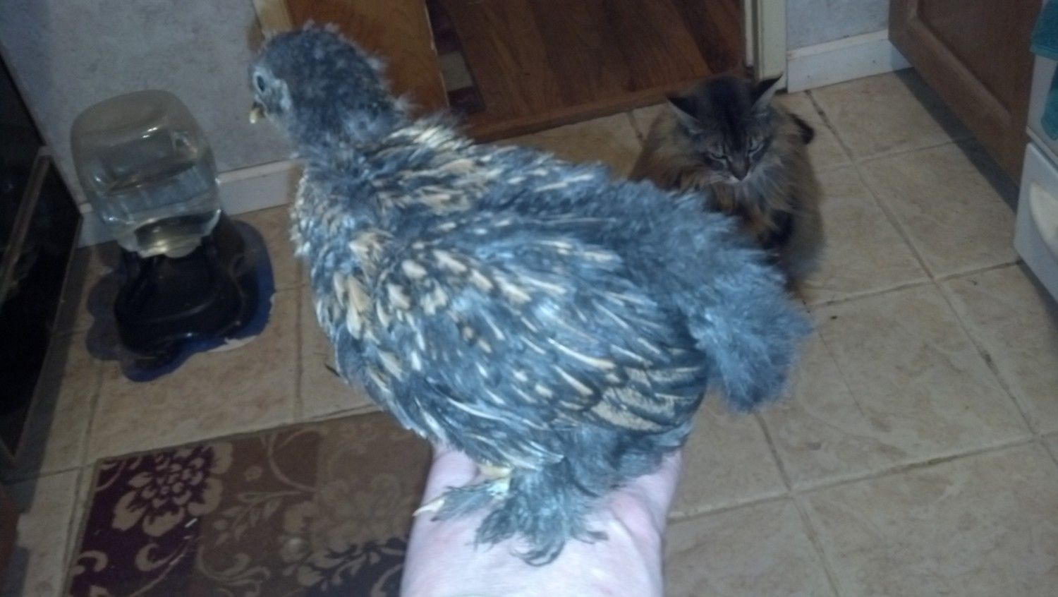 This is my black cochin bantam hen that I let take care of a duck for me.
